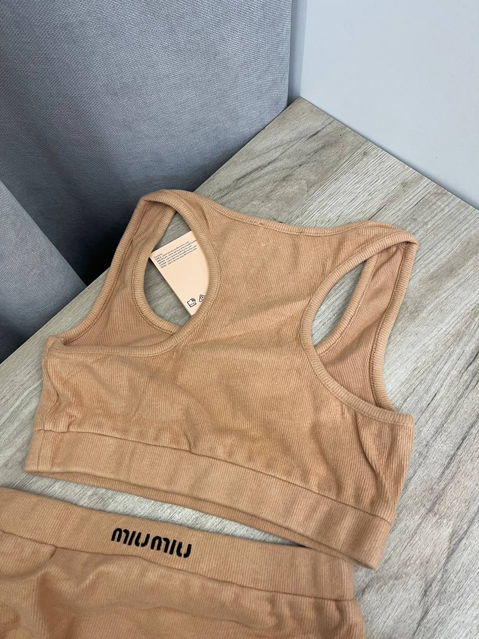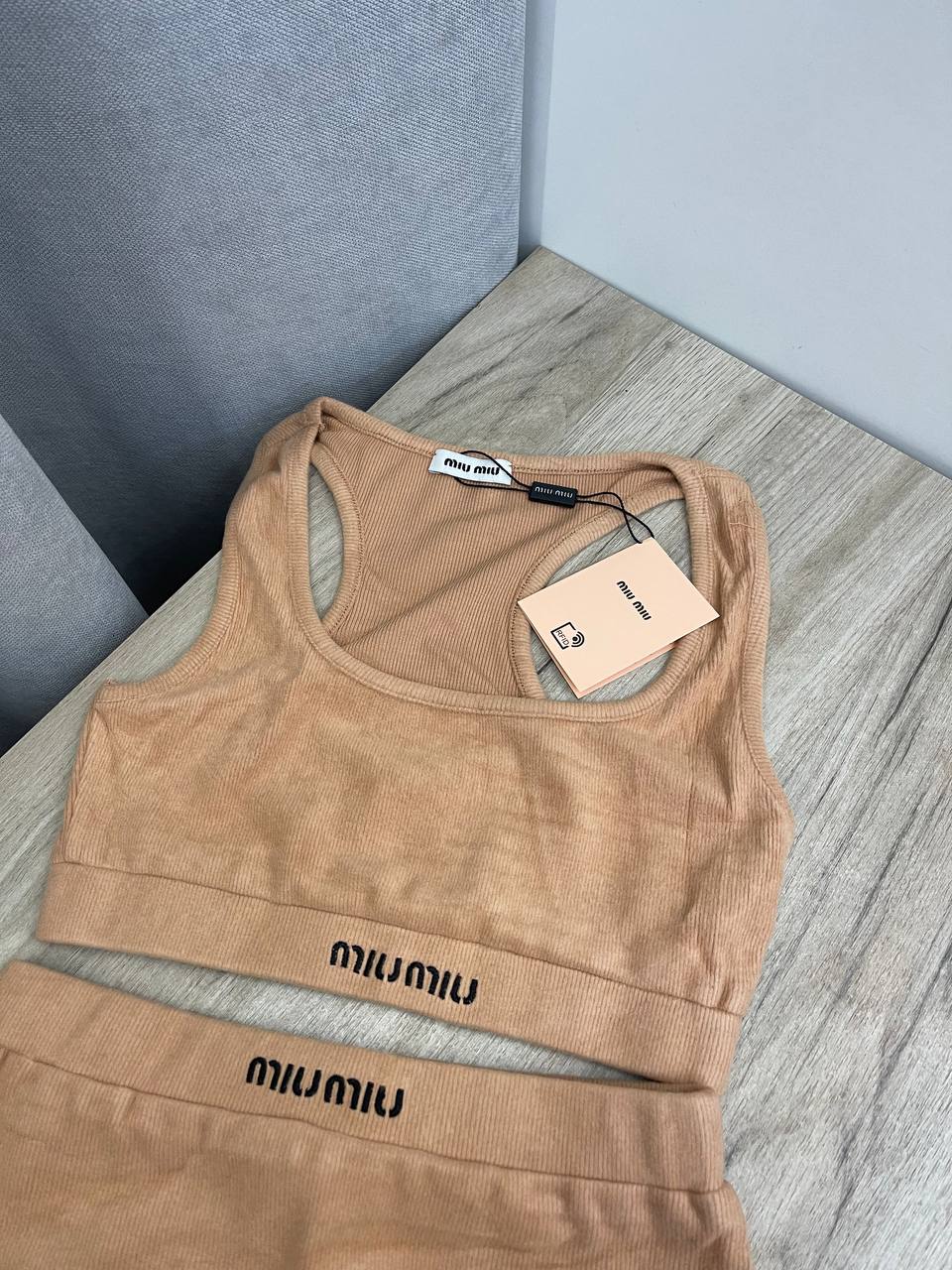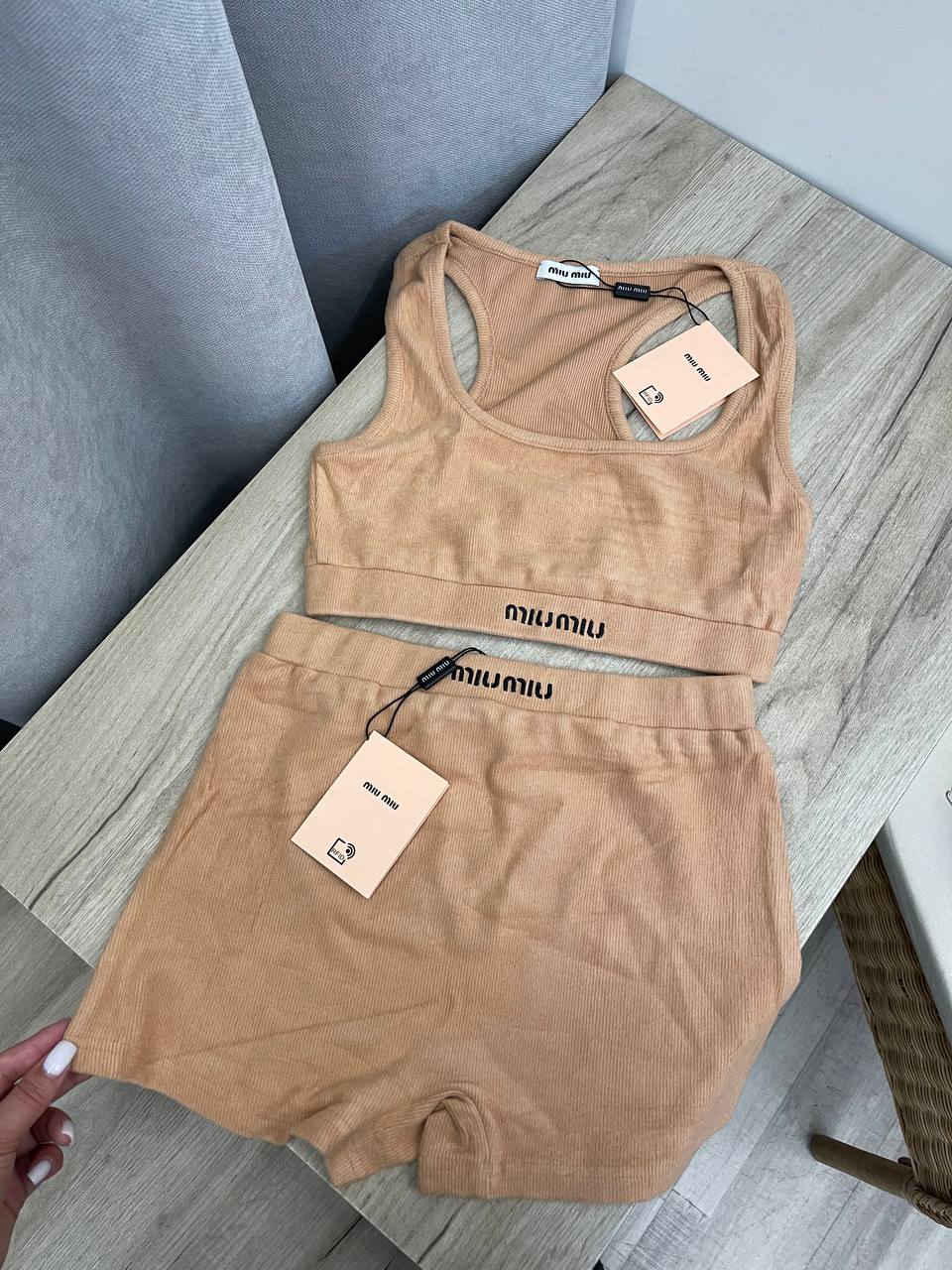 Комплект Miu Miu LUX-106562 — это стильный и комфортный комплект, который состоит из топа и шортиков. Комплект выполнен в приятном бежевом оттенке, который подчеркивает его лаконичный дизайн. Он идеально подходит для создания расслабленного и элегантного образа.