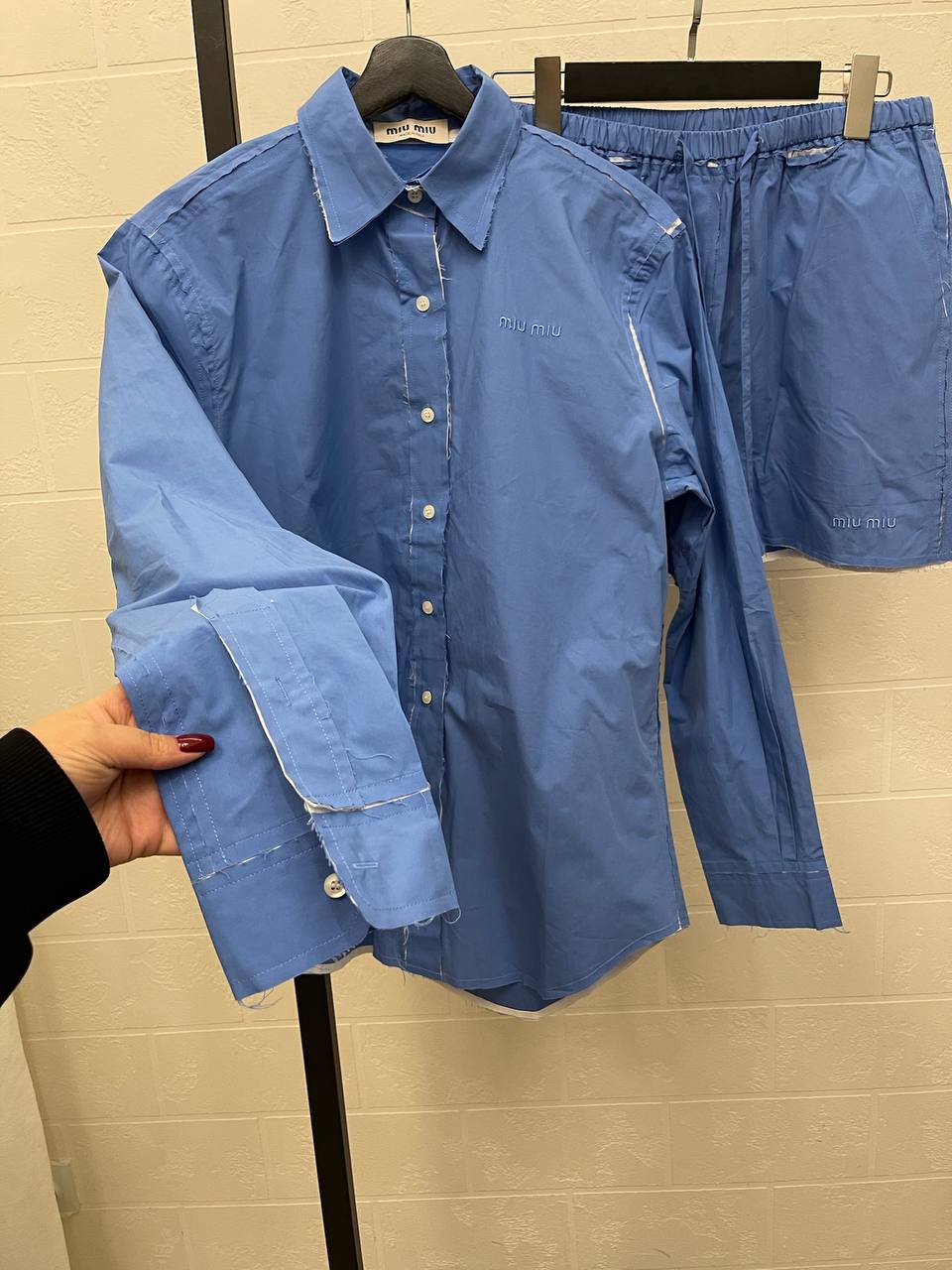 Костюм Miu Miu LUX-114589 представляет собой элегантный и современный наряд от известного бренда. Этот костюм состоит из рубашки с длинными рукавами и шорт, выполненных в привлекательном синем цвете. Идеально подойдет для создания стильных летних образов.