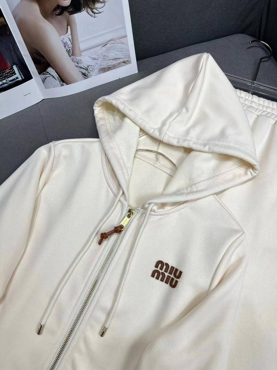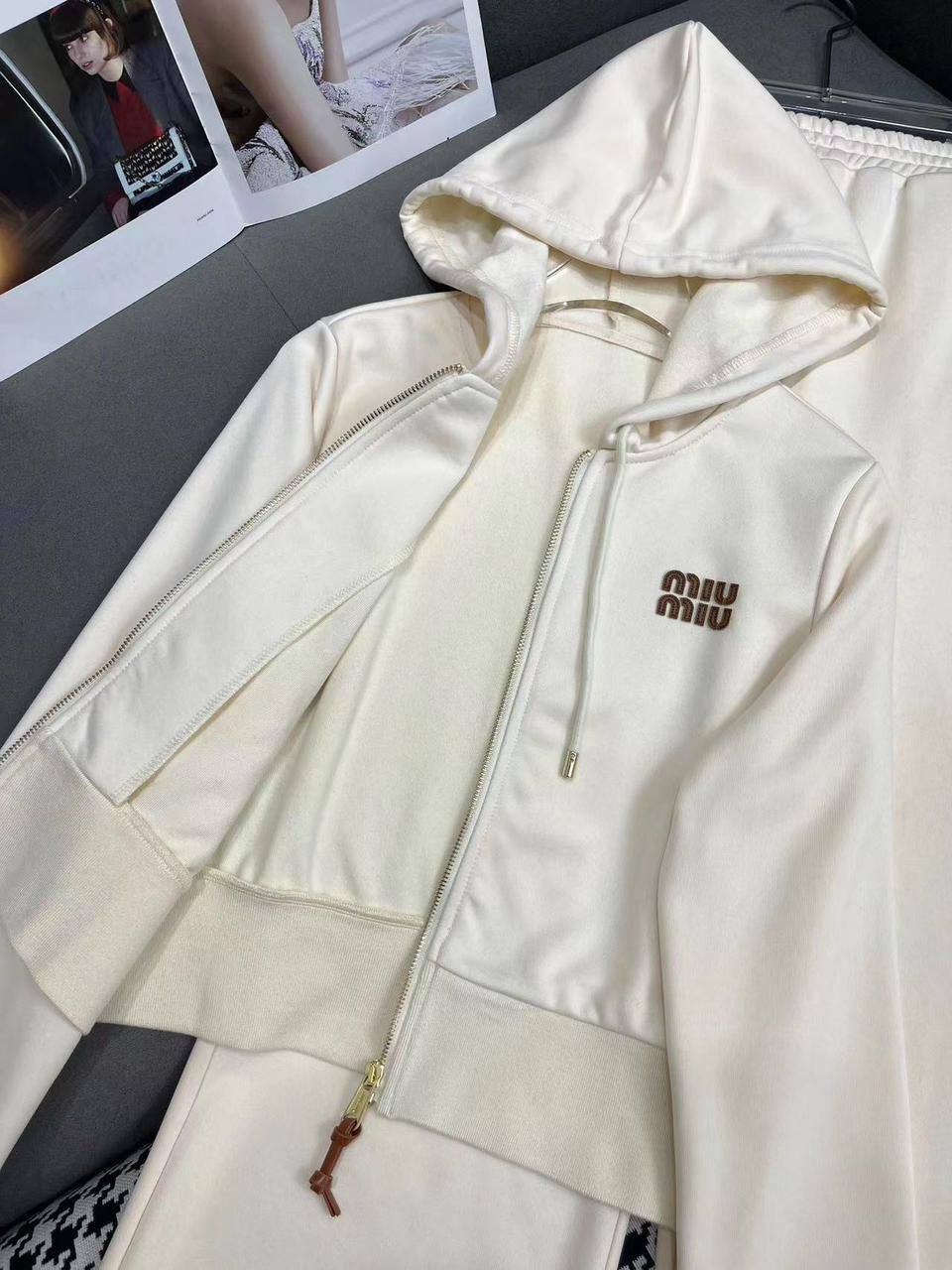 Костюм спортивный Miu Miu LUX-110877 – это стильный и комфортный комплект для создания элегантных образов. Данный костюм выполнен в светлом оттенке и состоит из худи на молнии с капюшоном и спортивных брюк. Он идеально подойдет для повседневной носки, прогулок и активного отдыха.