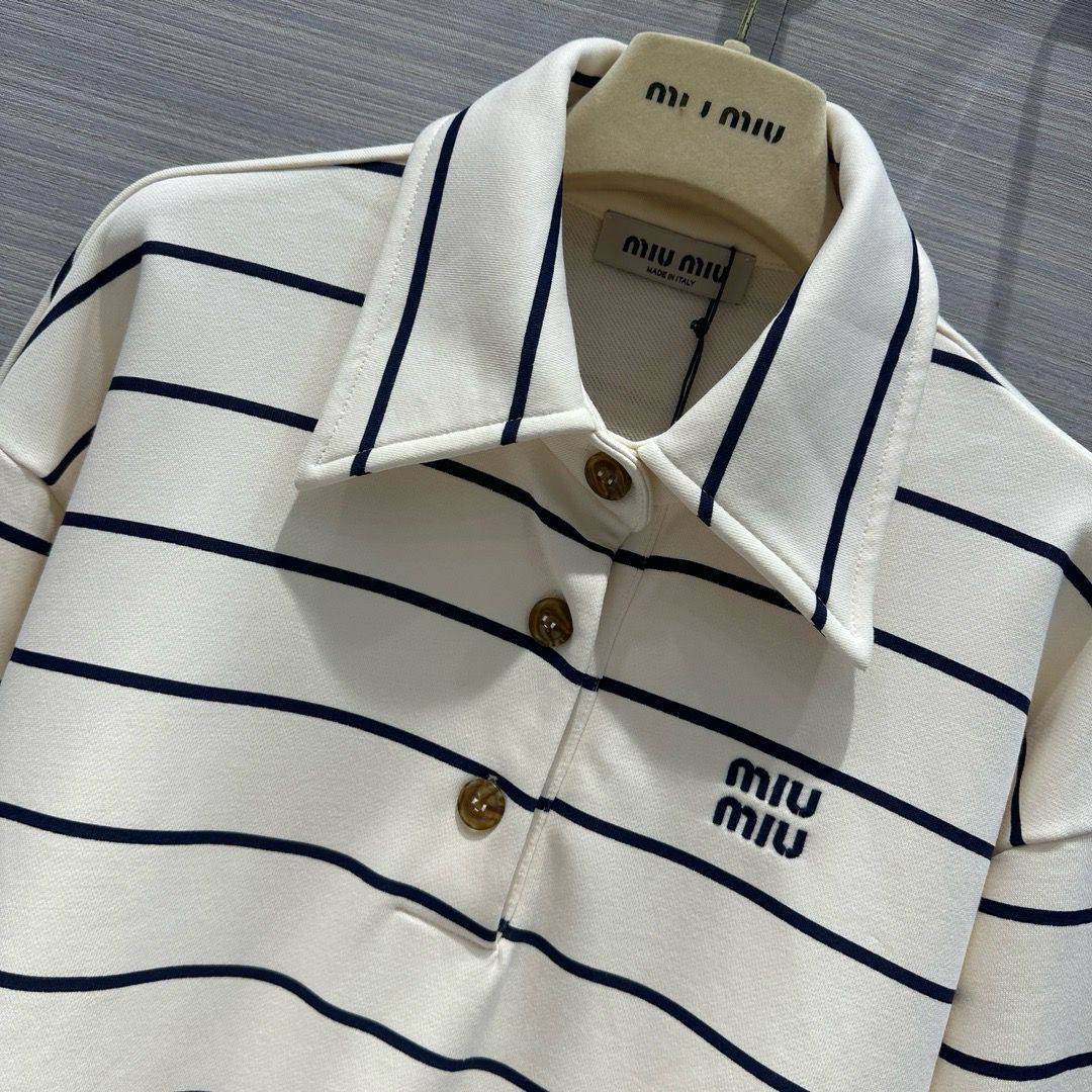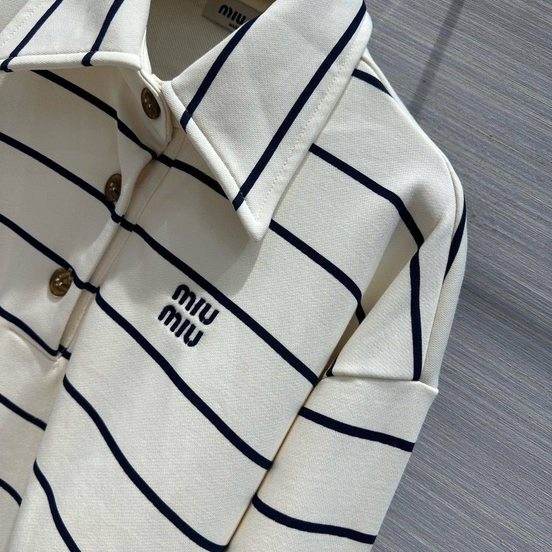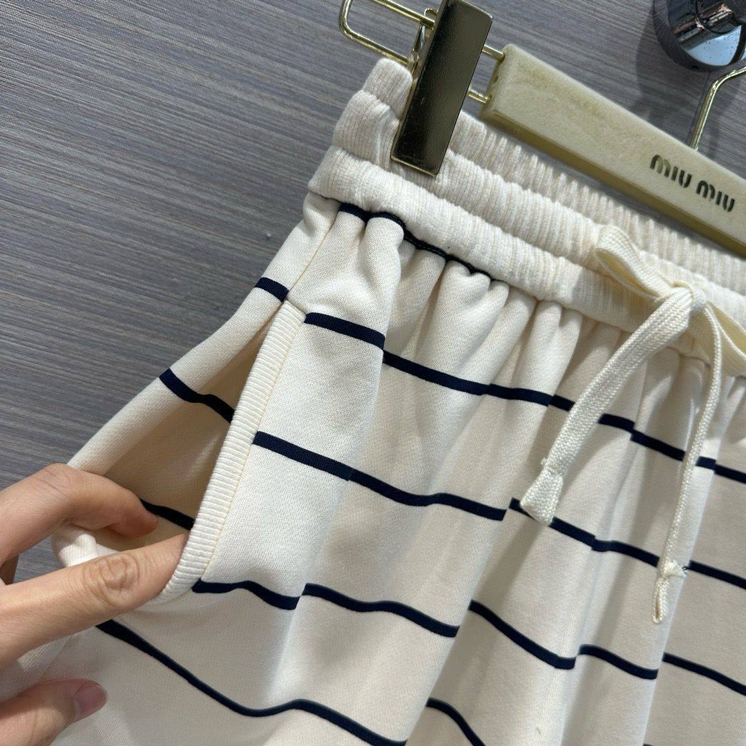 Костюм женский Miu Miu LUX-114309 — это стильный комплект, выполненный в спортивном стиле. Костюм включает в себя полосатую кофту с длинными рукавами и шорты. Светлый фон с темными полосами создает контрастный и запоминающийся образ.