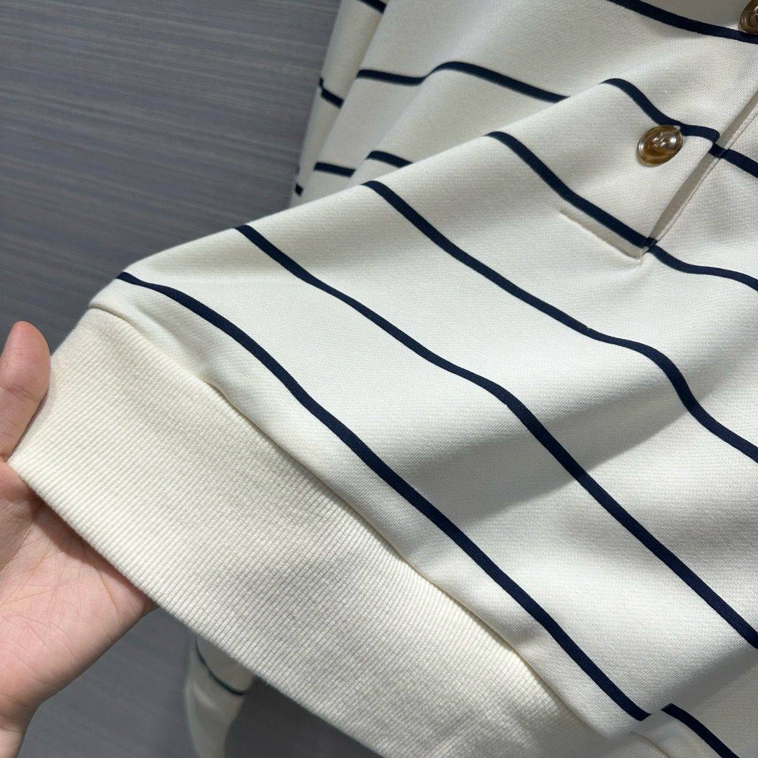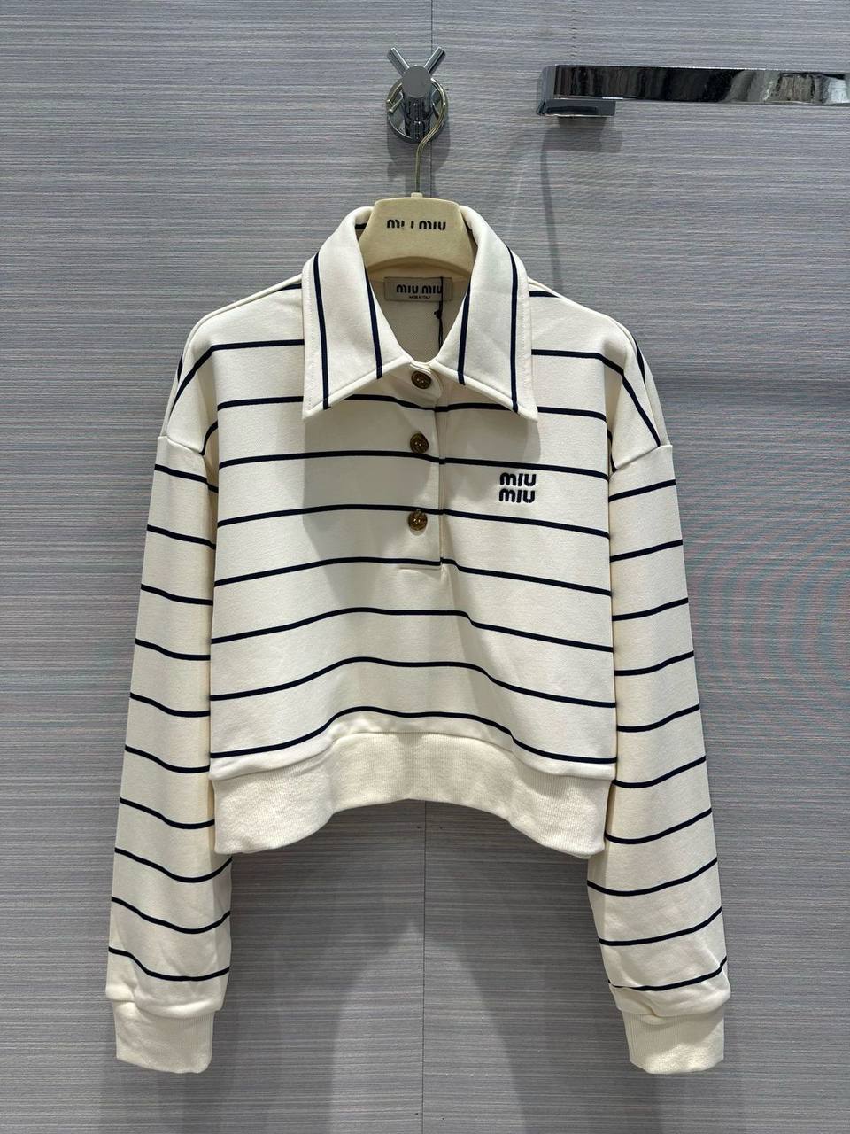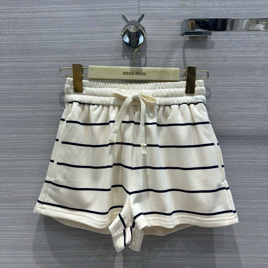 Костюм женский Miu Miu LUX-114309 — это стильный комплект, выполненный в спортивном стиле. Костюм включает в себя полосатую кофту с длинными рукавами и шорты. Светлый фон с темными полосами создает контрастный и запоминающийся образ.