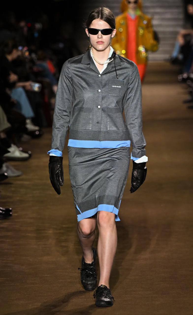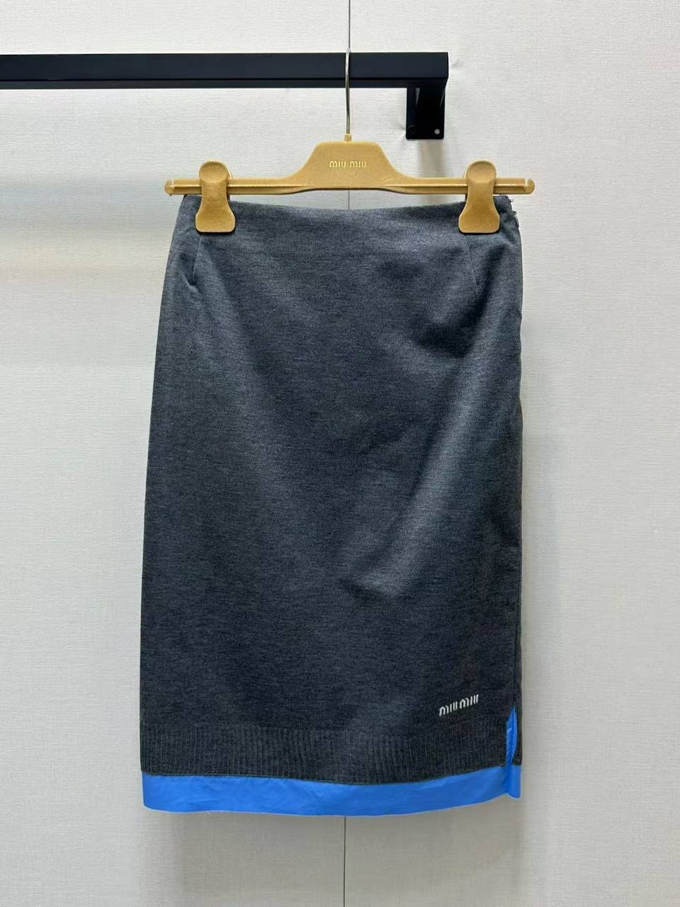 Костюм женский Miu Miu LUX-114686 - это стильный костюм для женщин, выполненный в классическом стиле. Костюм состоит из жакета и юбки. Серый цвет с голубыми вставками придает костюму изысканность.