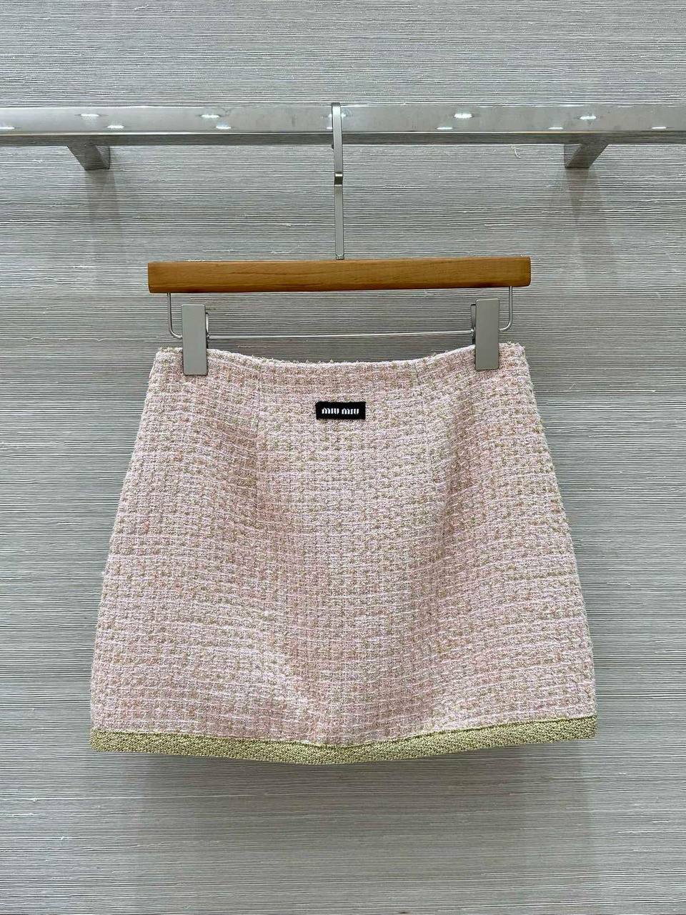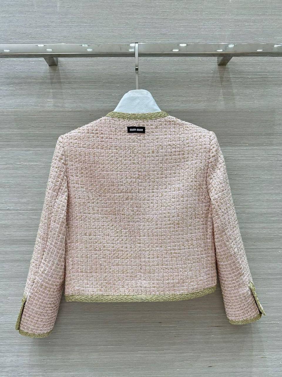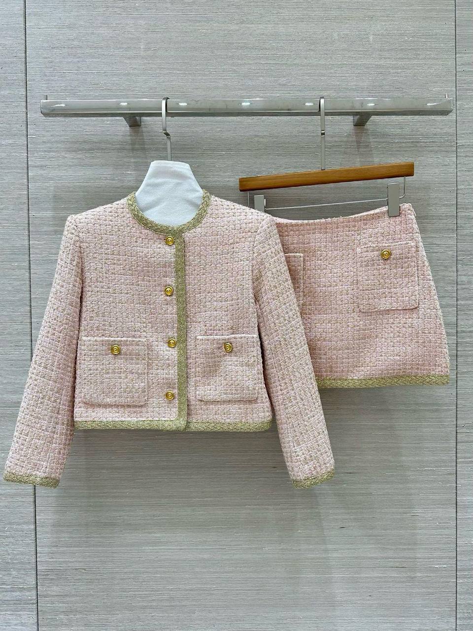 Костюм женский Miu Miu LUX-114726 представляет собой изысканный комплект, состоящий из жакета и юбки. Жакет и юбка выполнены в нежно-розовом цвете с золотистой отделкой, придающей образу роскошный вид. Комплект отличается классическим кроем и элегантным стилем, подходящим для различных мероприятий.