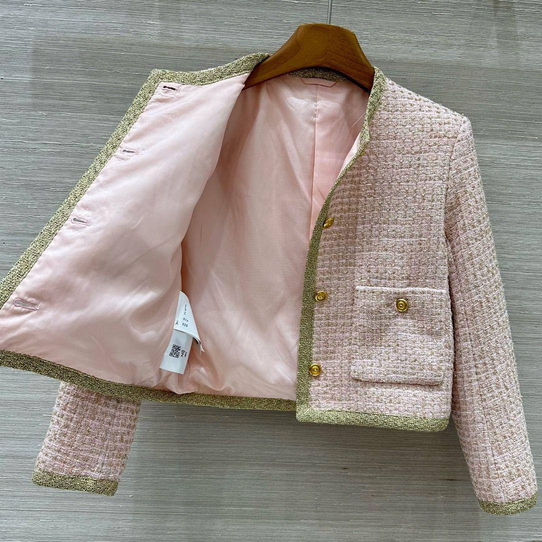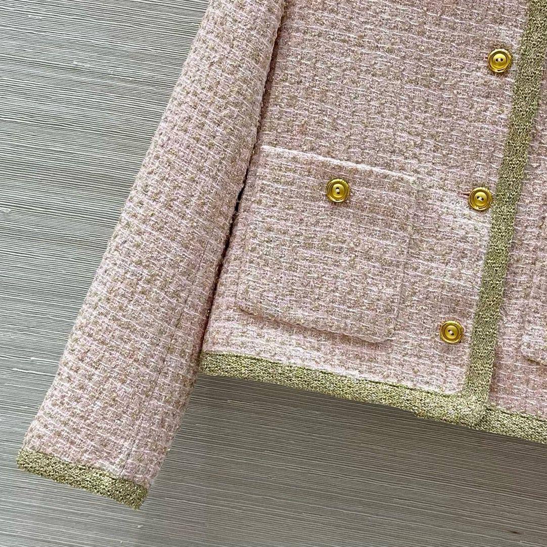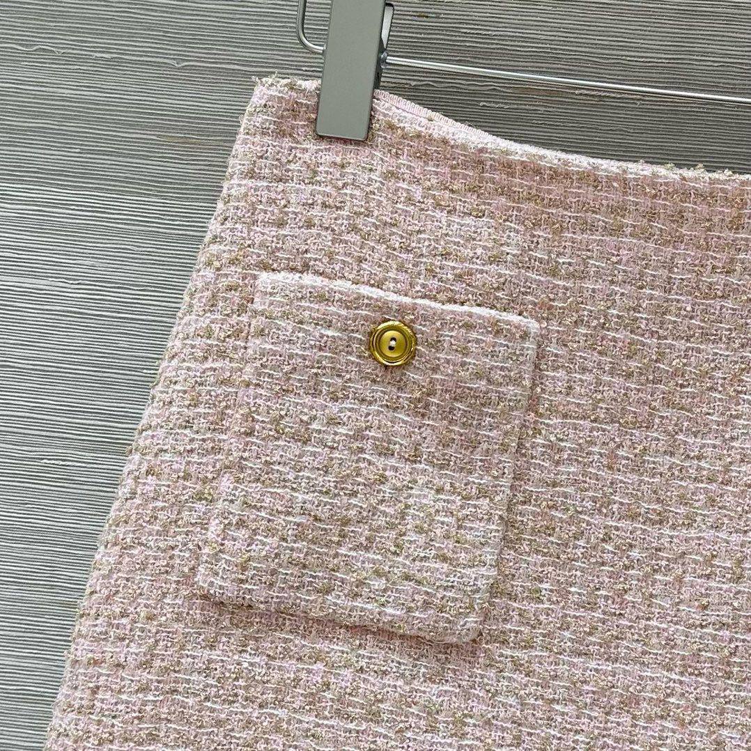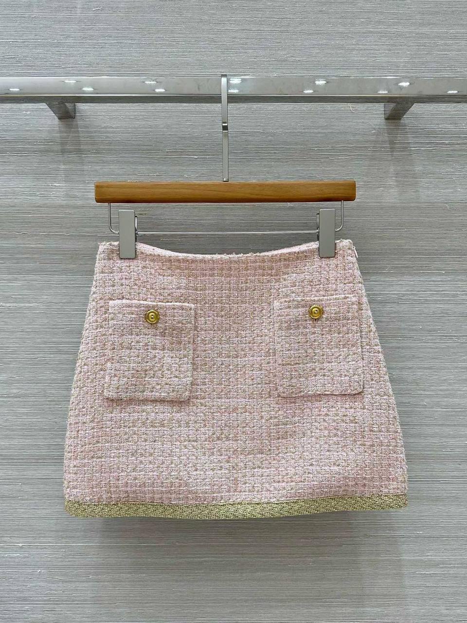 Костюм женский Miu Miu LUX-114726 представляет собой изысканный комплект, состоящий из жакета и юбки. Жакет и юбка выполнены в нежно-розовом цвете с золотистой отделкой, придающей образу роскошный вид. Комплект отличается классическим кроем и элегантным стилем, подходящим для различных мероприятий.