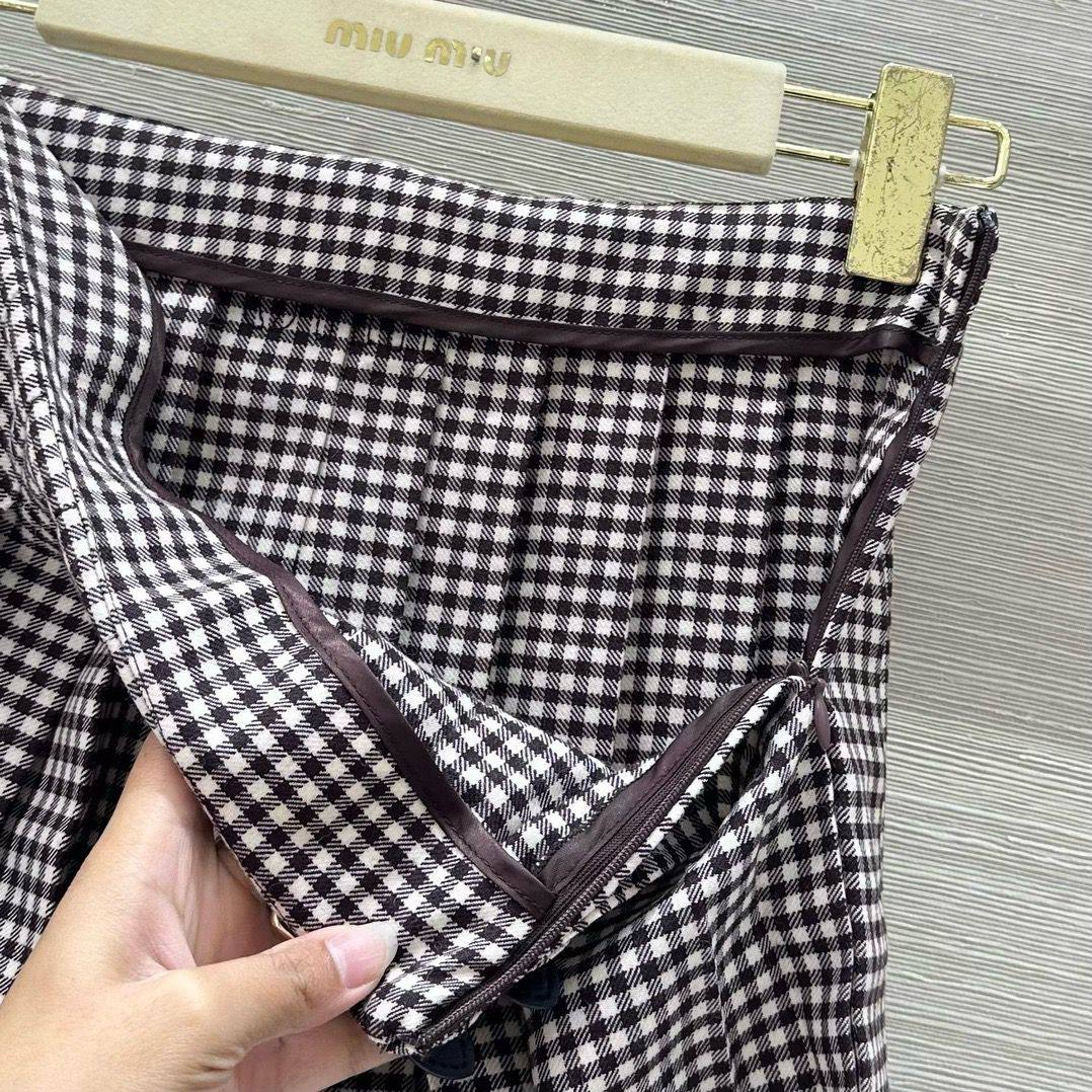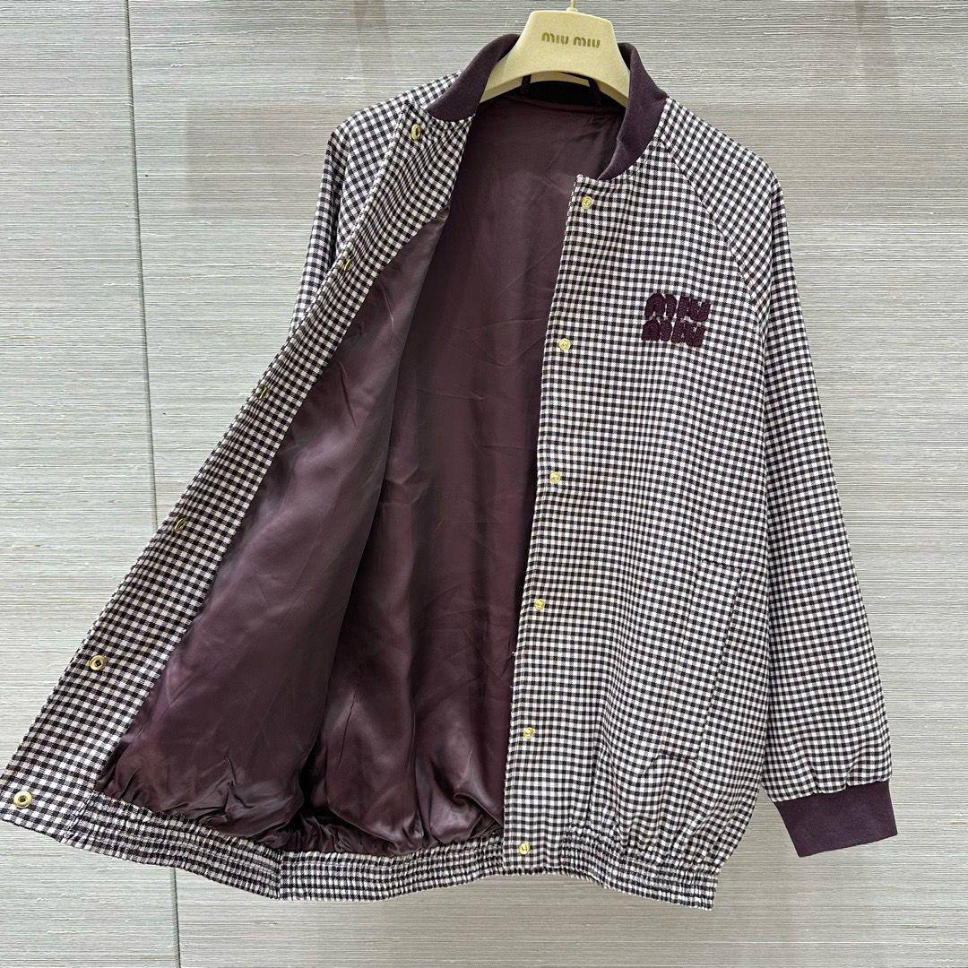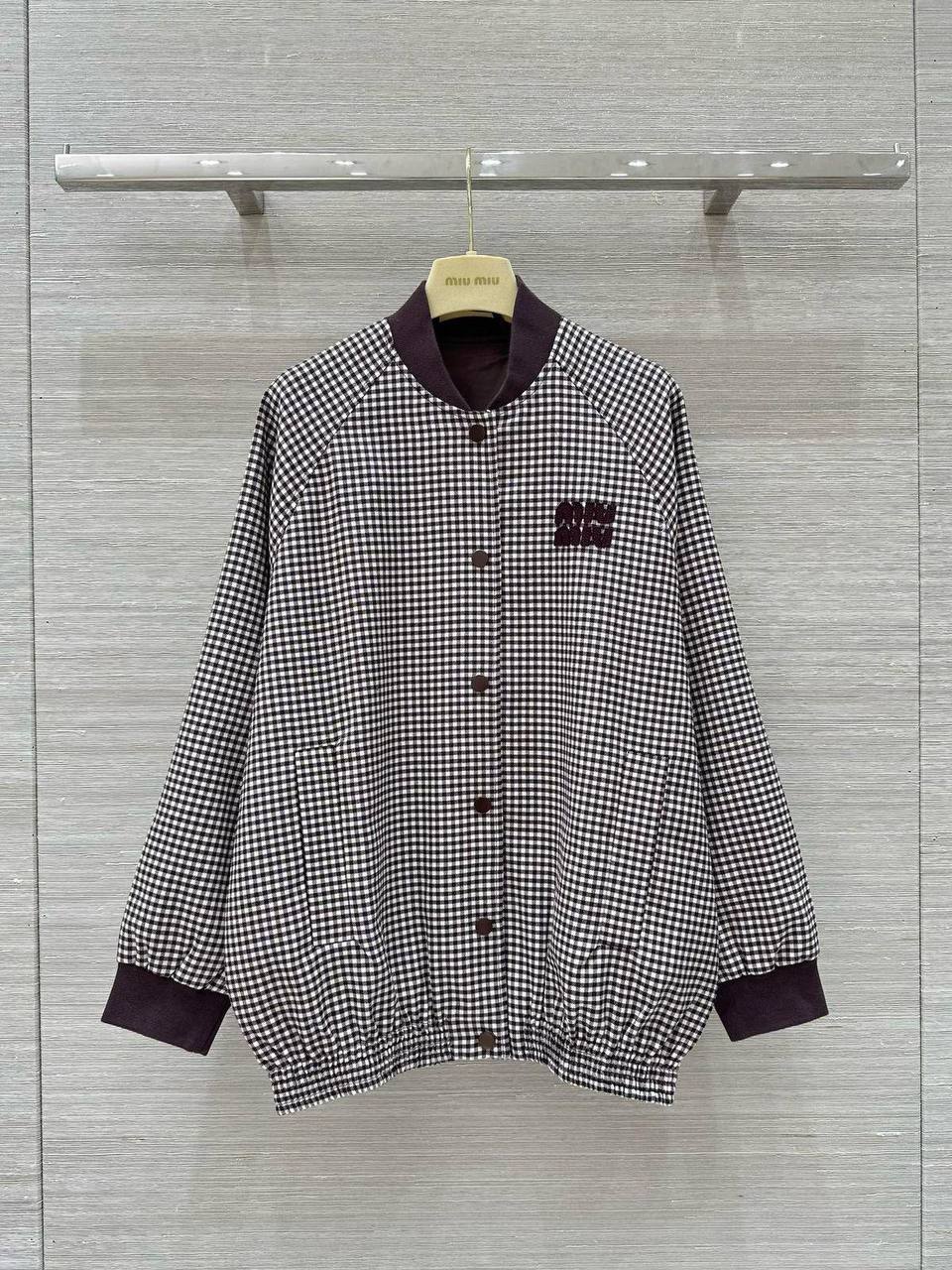Бомбер Miu Miu LUX-115111 — это стильный предмет гардероба в стиле casual. Бомбер выполнен в клетчатом принте, сочетающем коричневые и белые тона, с контрастными манжетами и воротником. Этот предмет одежды идеально подходит для создания повседневных образов, добавляя нотку элегантности.