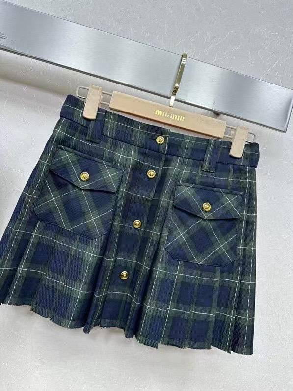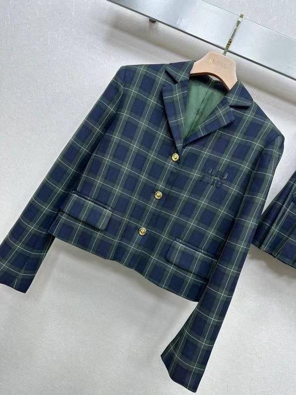 Костюм женский Miu Miu LUX-116110 представляет собой элегантный костюм в клетку, состоящий из жакета и юбки. Костюм выполнен в классическом стиле, предлагая стильный образ для различных мероприятий. Темно-зеленый цвет с белыми линиями создает утонченный вид.