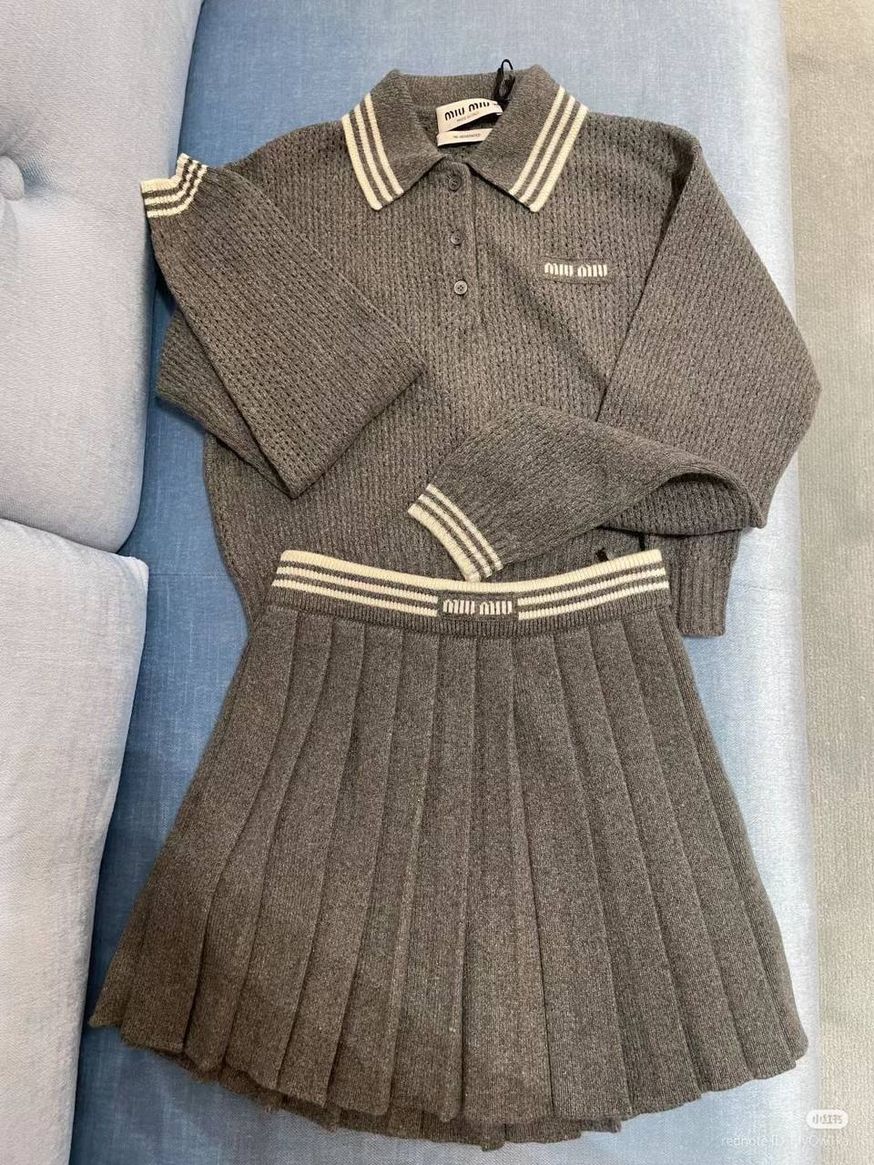 Женский костюм Miu Miu – стильный и элегантный выбор для создания модного образа. Комплект состоит из кофты с длинными рукавами и плиссированной юбки, выполненных в едином стиле.