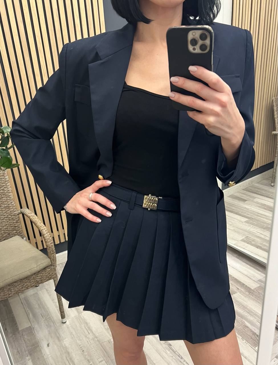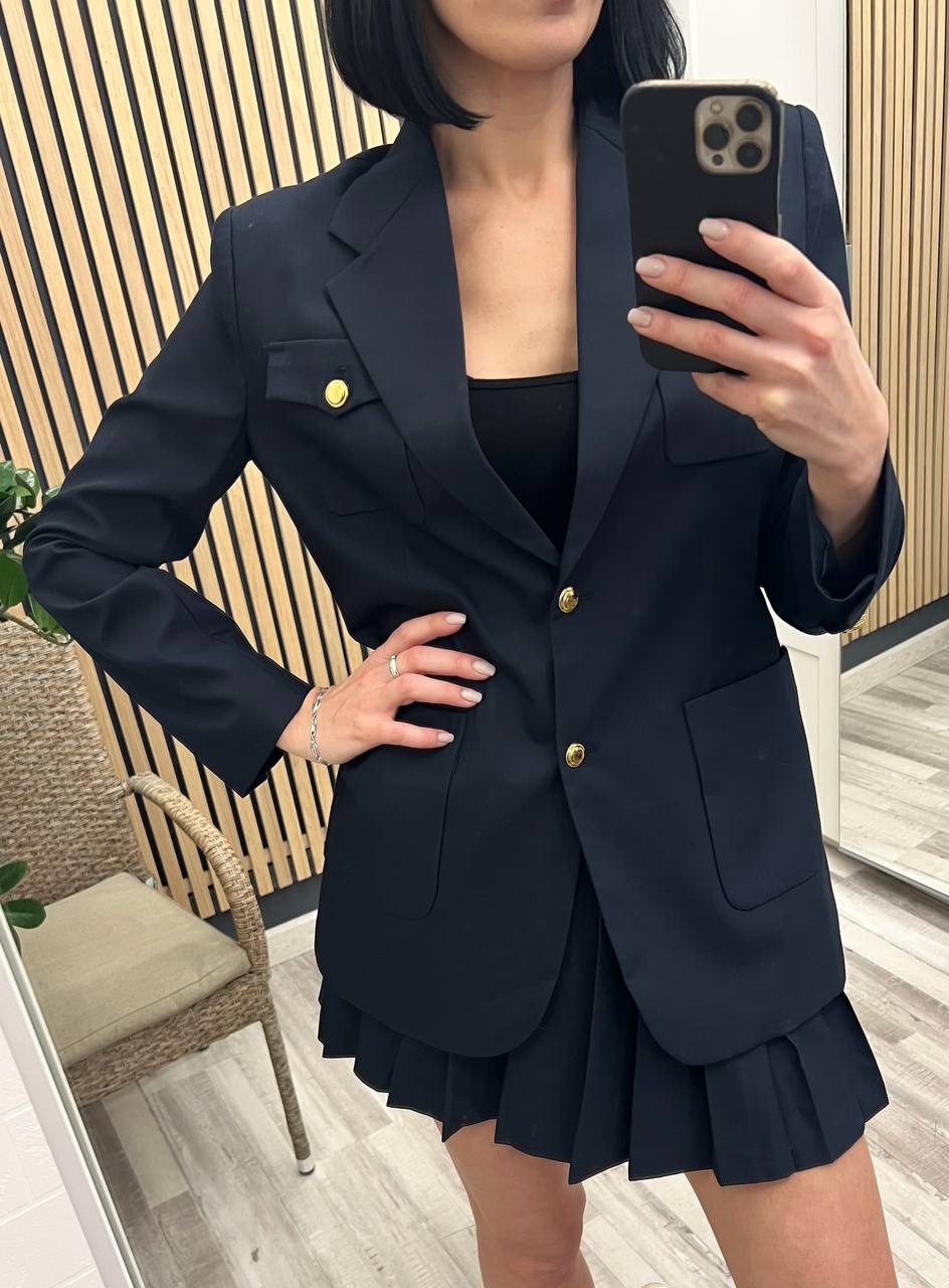 Костюм женский Miu Miu LUX-96592, представленный на изображении, — это стильный и элегантный комплект. Он состоит из темно-синего жакета с золотыми пуговицами и юбки в складку. Этот костюм подойдет для создания как деловых, так и повседневных образов.
