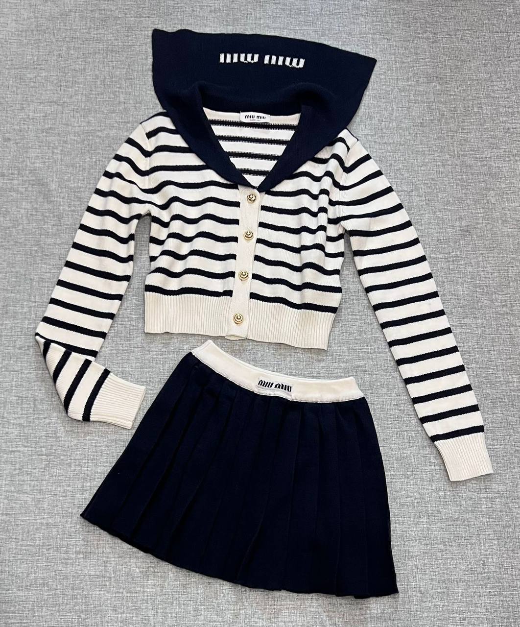 Костюм женский Miu Miu LUX-97488 - это элегантный ансамбль, который состоит из кофты на пуговицах и плиссированной юбки. Костюм выполнен в классическом стиле, сочетает в себе полосатый верх и однотонный низ, что добавляет образу свежести и современности. Идеально подходит для создания стильного и запоминающегося образа.