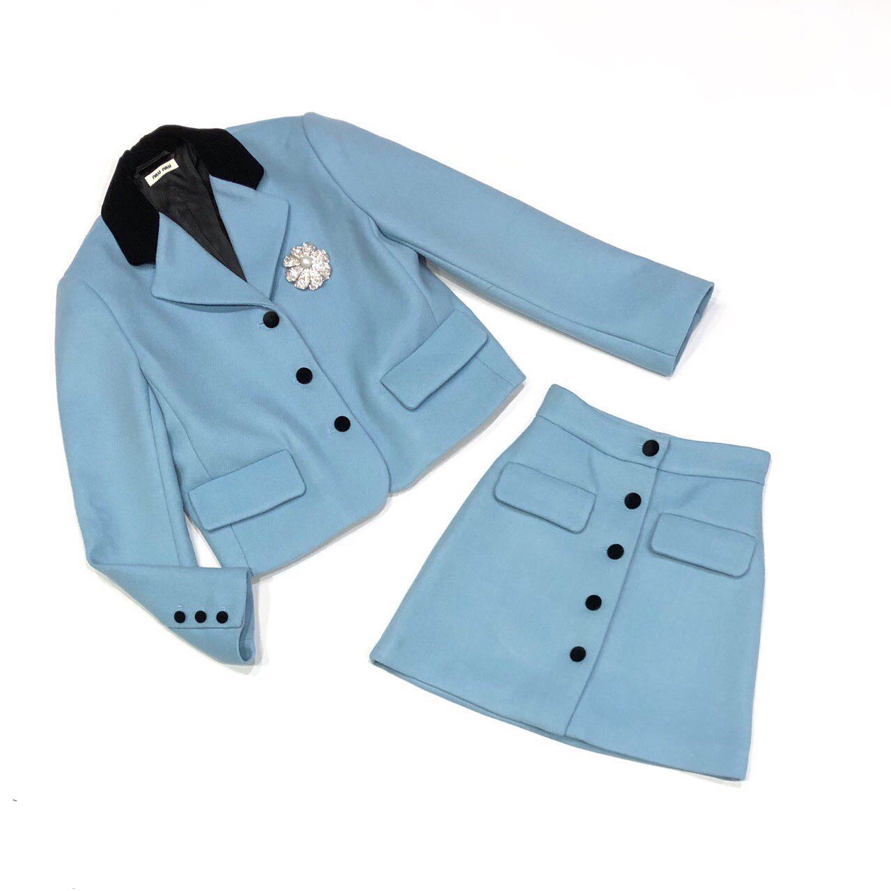 Костюм женский Miu Miu LUX-36943 представляет собой элегантный и стильный комплект, состоящий из приталенного пиджака и юбки-трапеции. Модель выполнена в нежном голубом цвете и украшена черным бархатным воротником и декоративной брошью на пиджаке. Этот костюм прекрасно подойдет для создания изысканных образов для особых случаев или деловых встреч.