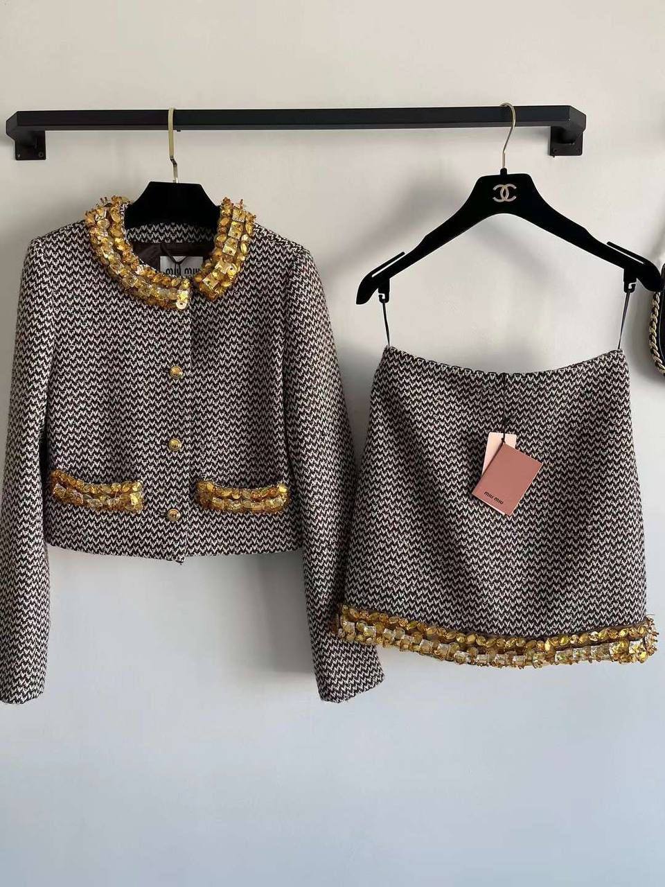 Костюм женский Miu Miu LUX-100658 представляет собой элегантный костюм-двойку. Он выполнен в классическом стиле с декоративными элементами. Основной цвет — черно-белый, что придает костюму универсальность и возможность сочетания с различными аксессуарами.
