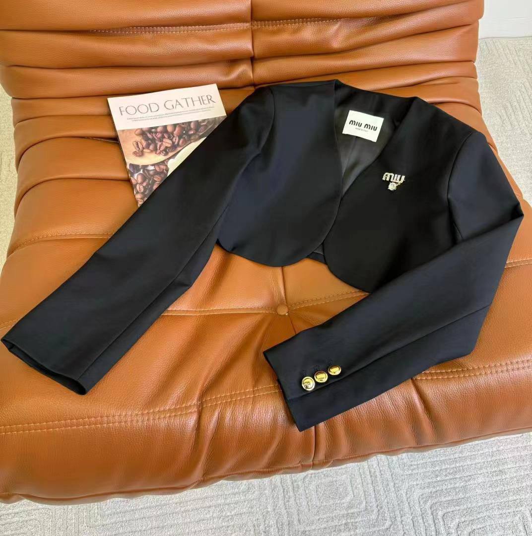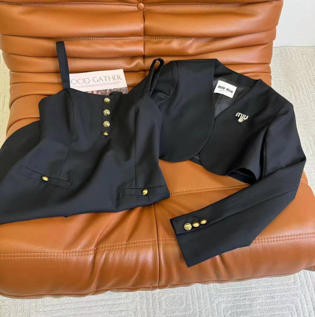 Костюм женский Miu Miu LUX-104075 представляет собой элегантный комплект в классическом стиле. Комплект состоит из топа-бюстье и короткого пиджака, выполненных в черном цвете. Ткань имеет гладкую текстуру, а золотые пуговицы добавляют изысканности. Этот костюм идеально подойдет для создания деловых и вечерних образов.