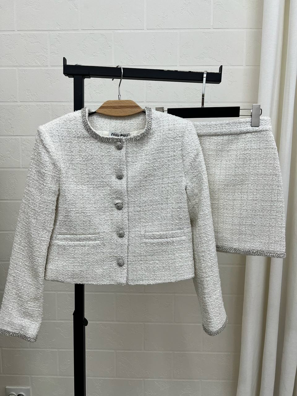 Костюм женский Miu Miu LUX-105481 представляет собой элегантный комплект, выполненный в стиле твидового жакета и юбки. Белый цвет костюма придает ему свежесть и легкость, а текстура ткани добавляет изысканности. Идеально подойдет для создания стильного и женственного образа.