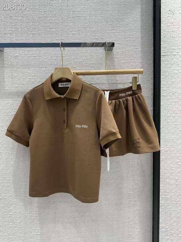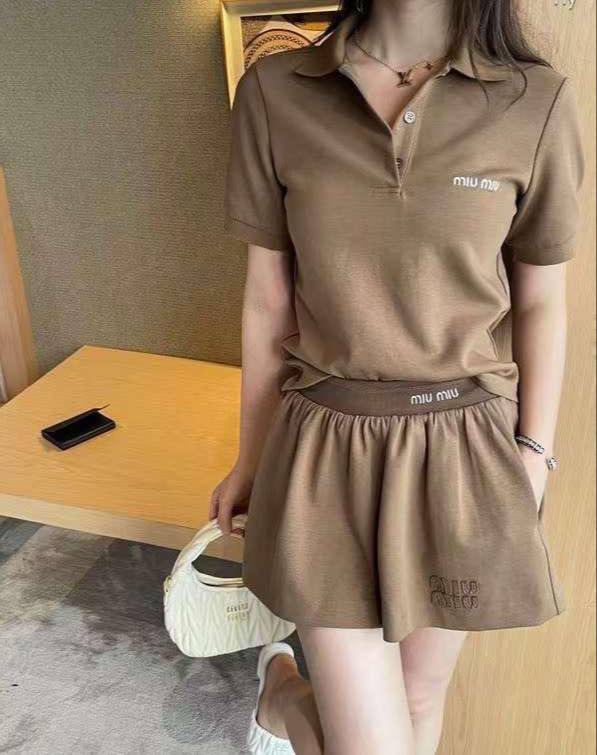Костюм женский Miu Miu LUX-107668 — это элегантный ансамбль, который состоит из футболки поло и шорт. Костюм выполнен в теплом коричневом оттенке. Дизайн костюма подчеркивает логотип бренда.
