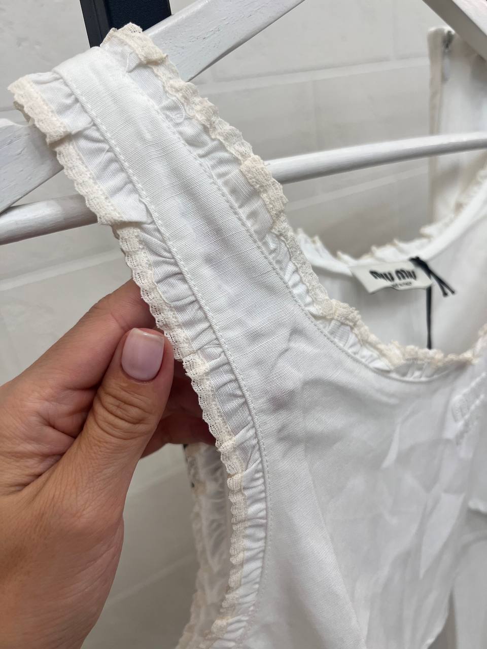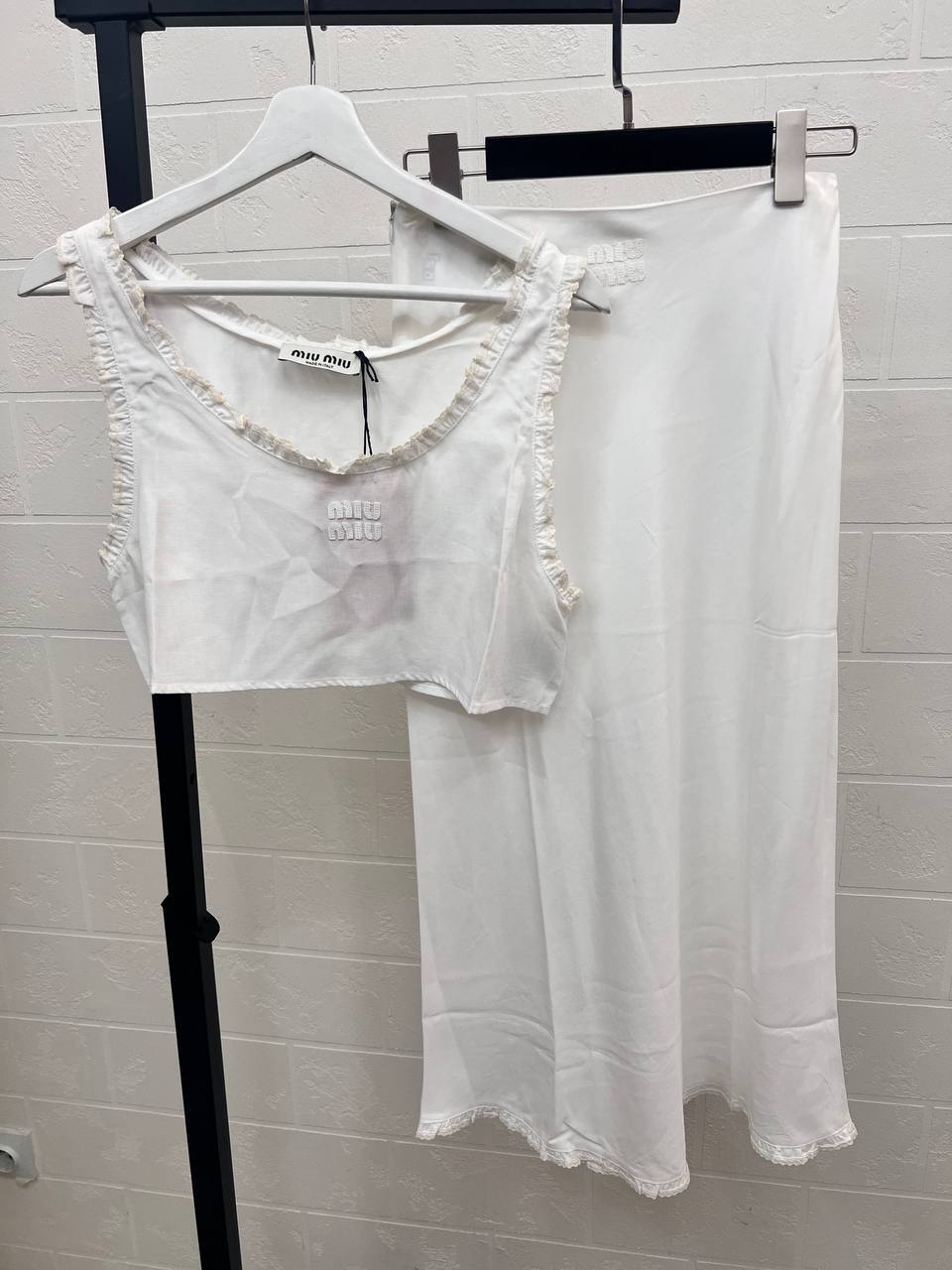 Костюм женский Miu Miu LUX-108454 представляет собой элегантный комплект из двух предметов: топа и юбки. Топ выполнен в виде майки с декоративной отделкой по краям, юбка - прямого кроя. Комплект выполнен в белом цвете, что придает ему свежий и легкий вид, идеальный для летнего сезона.