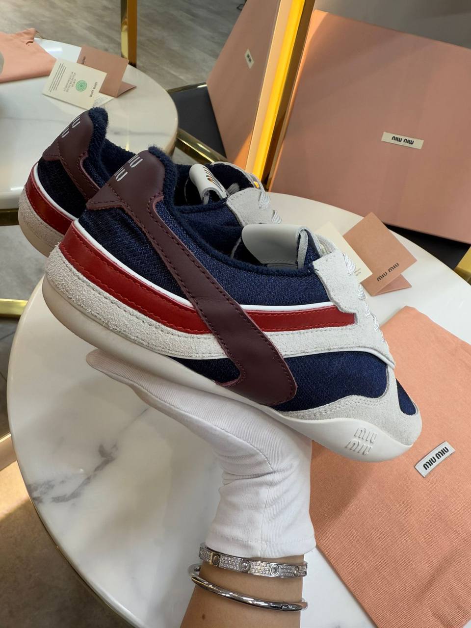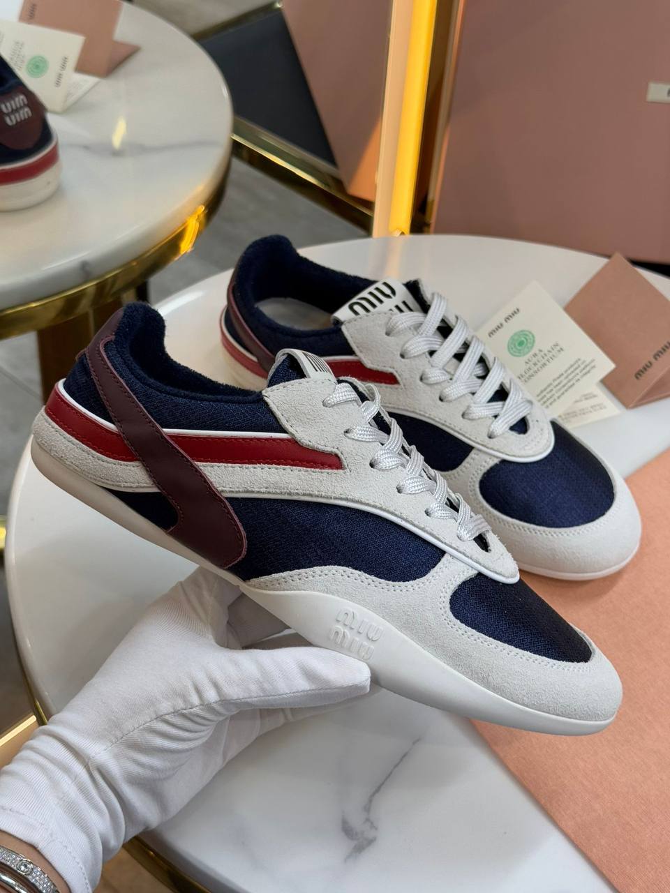 Кроссовки Miu Miu LUX-119111 — это стильная модель, сочетающая в себе спортивный дизайн и элегантность. Кроссовки выполнены в бело-сине-красной цветовой гамме, что придает им яркий и запоминающийся вид. Они идеально подойдут для создания повседневных образов, подчеркивая индивидуальность.