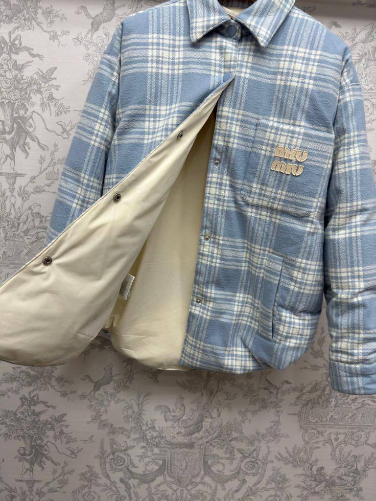 Куртка-рубашка Miu Miu LUX-98390 выполнена в стиле casual. Небесно-голубой цвет в клетку придает изделию свежий и современный вид. Куртка-рубашка подойдет для повседневной носки в прохладную погоду.