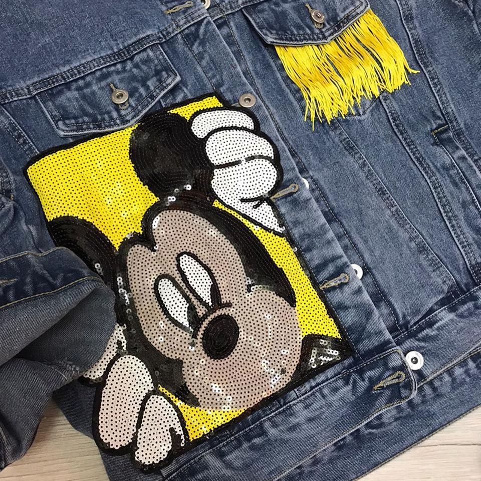 Женская джинсовая куртка Miu Miu LUX-29921 – это стильное и оригинальное дополнение к повседневному гардеробу. Куртка выполнена в синем деним цвете и украшена ярким принтом с Микки Маусом, декорированным пайетками, а также золотистой бахромой на накладном кармане. Эта модель идеально подойдет для создания запоминающихся образов и привлечения внимания.