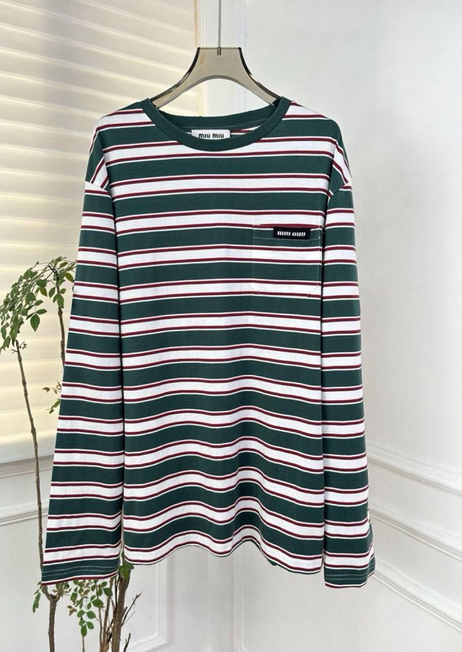 Лонгслив Miu Miu LUX-107550 представляет собой стильный предмет гардероба, выполненный в классическом стиле. Основной цвет - зеленый, дополненный белыми и бордовыми полосами. Изделие имеет длинные рукава и круглый вырез горловины.
