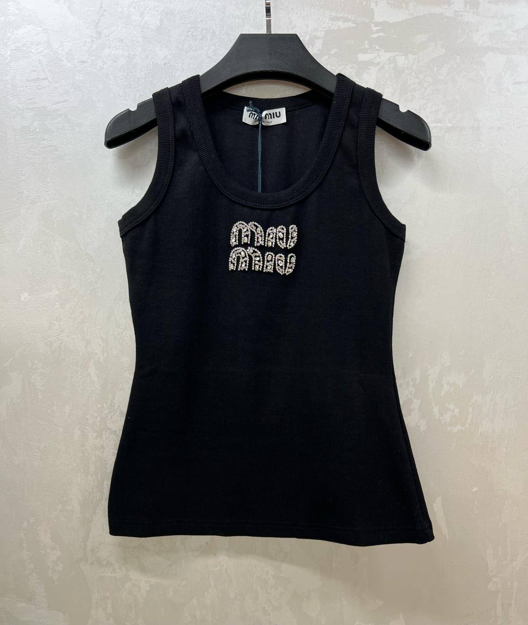Майка Miu Miu LUX-118427 – это стильный предмет гардероба, который сочетает в себе элегантность и современный дизайн. Майка выполнена в классическом черном цвете и имеет облегающий силуэт. Она украшена логотипом бренда, выполненным из блестящих элементов, что придает изделию особый шарм.