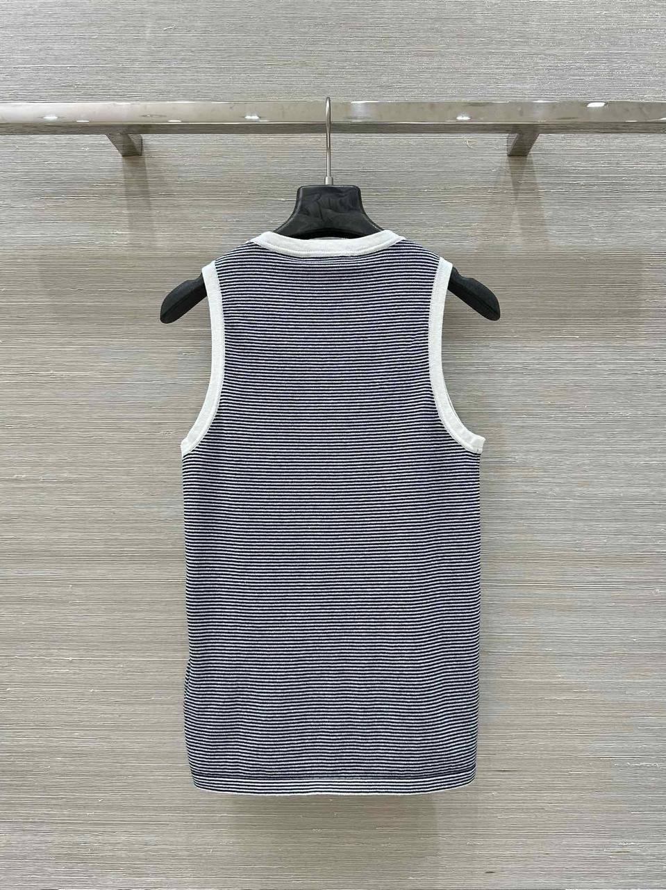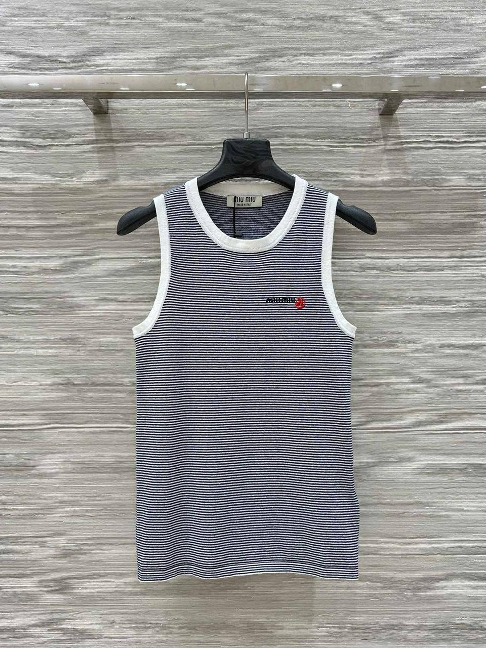 Майка Miu Miu LUX-118541 — это стильный предмет гардероба, который сочетает в себе классический дизайн и современный стиль. Она выполнена в сине-белую полоску, с белыми вставками по краям горловины и пройм, что придает ей свежий и летний вид. Майка подойдет для создания как повседневных, так и более нарядных образов.