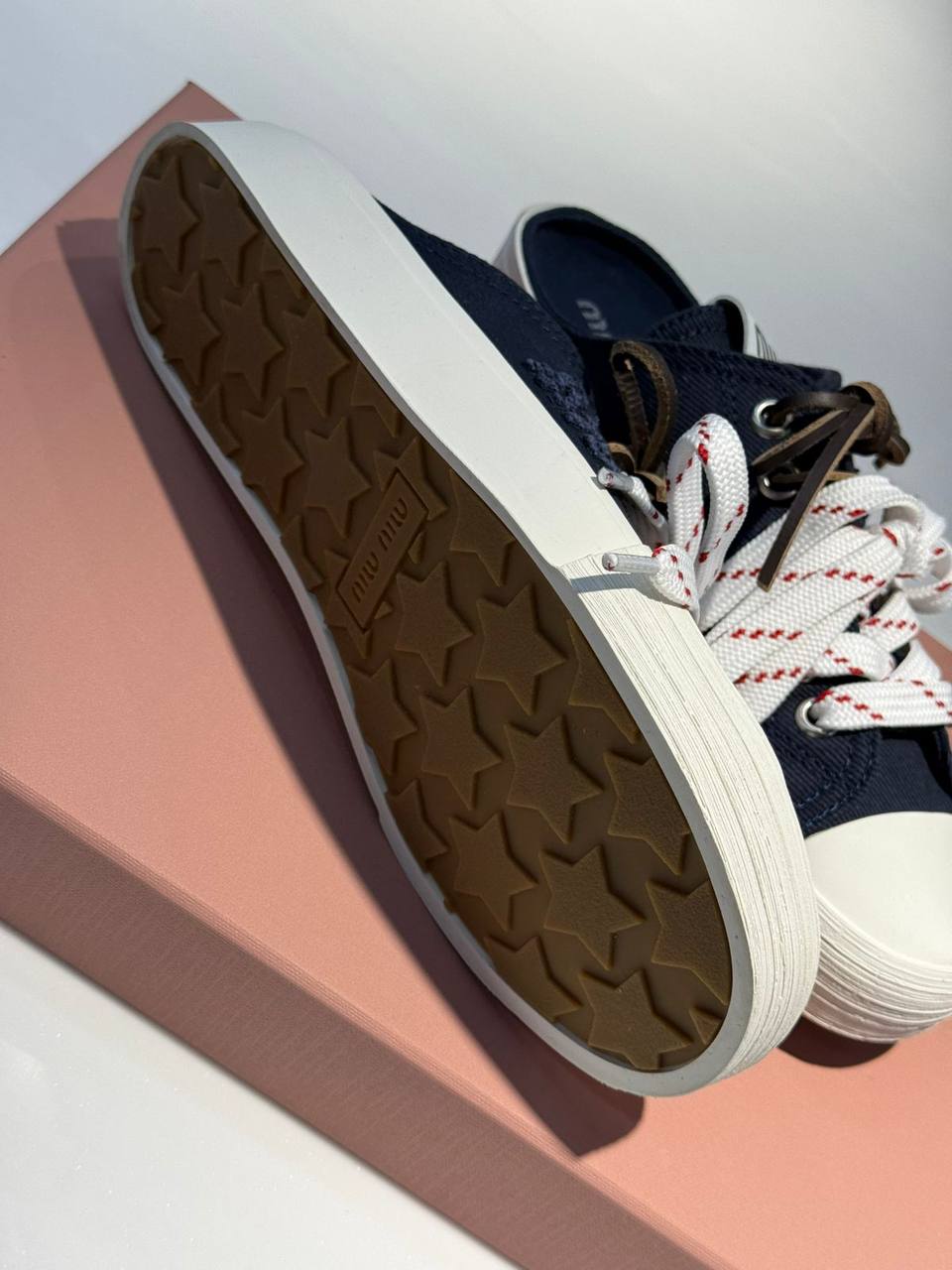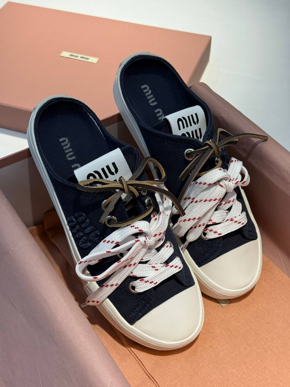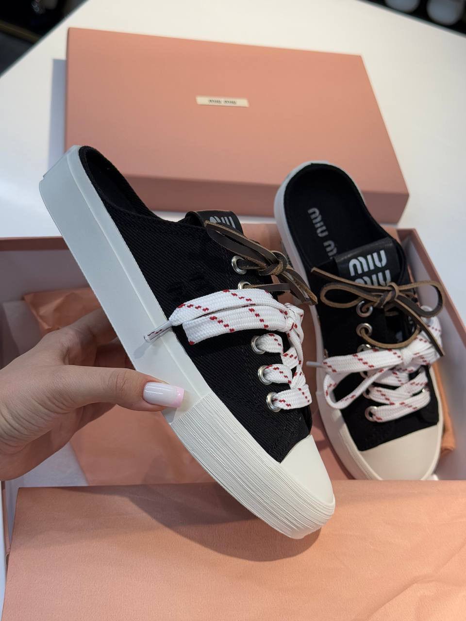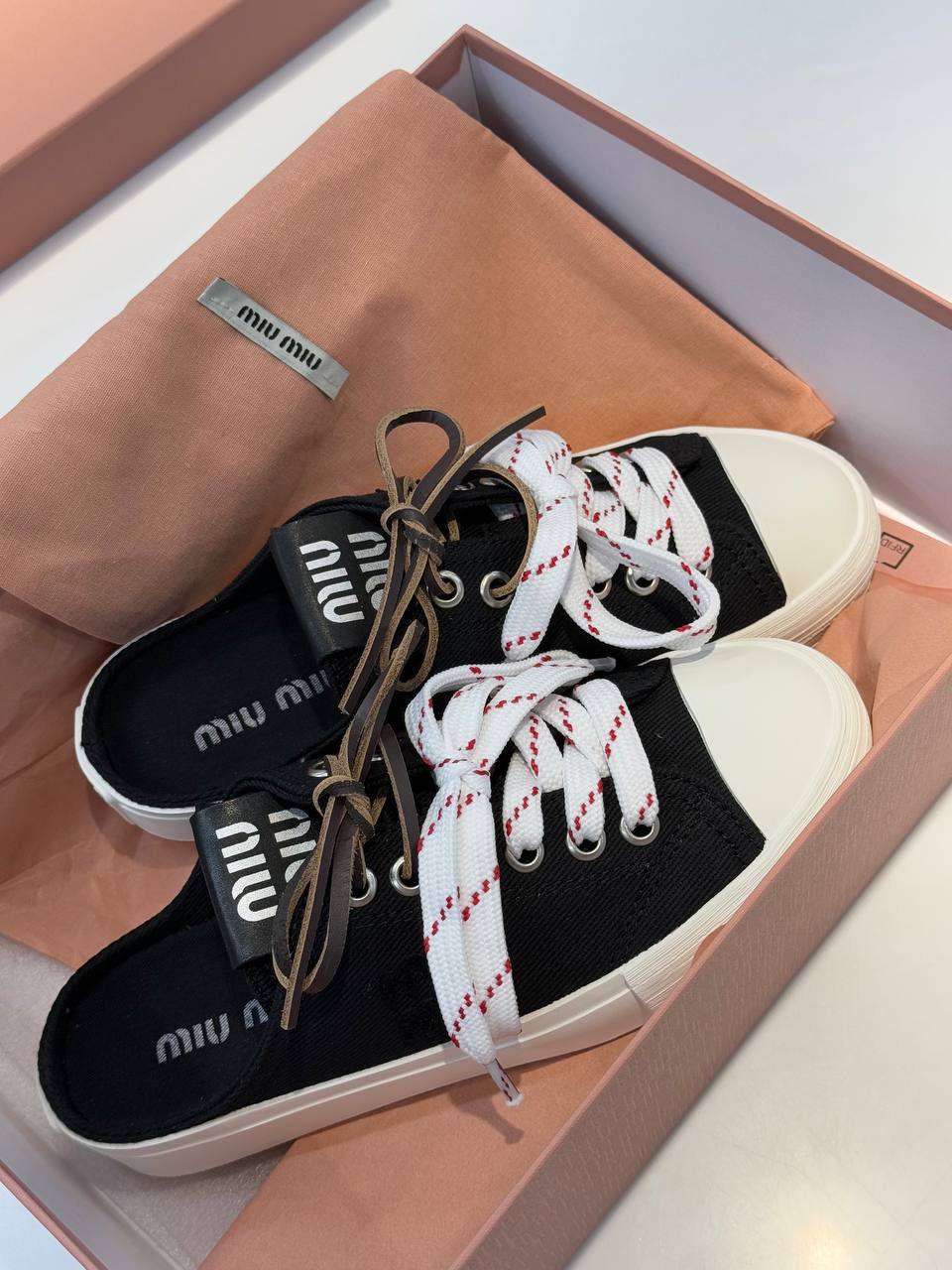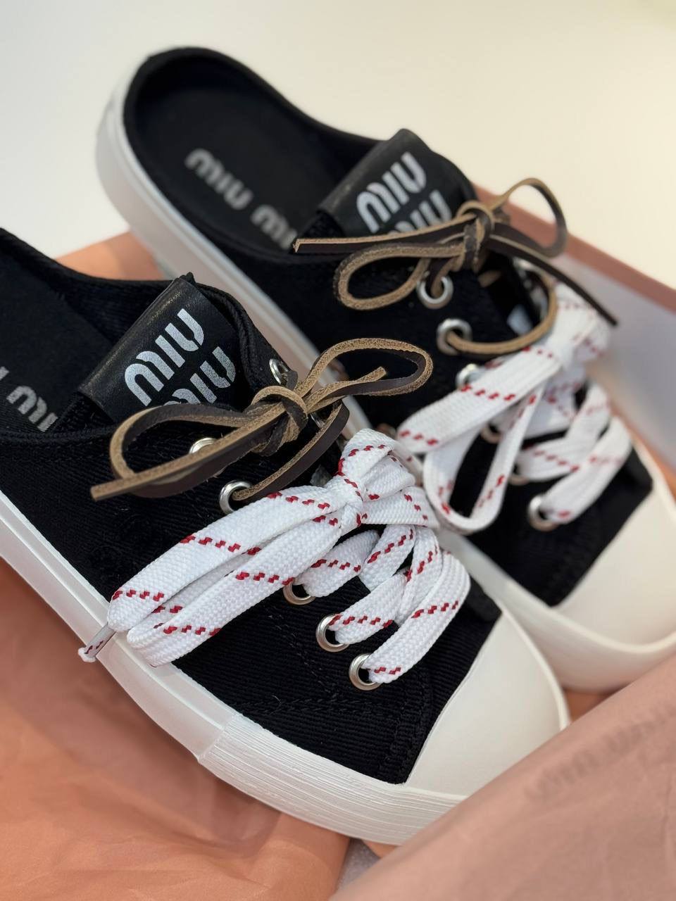 Мюли Miu Miu LUX-119805 — это стильная и удобная обувь, сочетающая в себе элементы кед и мюлей. Черные мюли с белой подошвой, украшены белыми шнурками с красными полосками, создают яркий акцент. Идеально подойдут для повседневной носки, добавляя образу свежесть и современность.