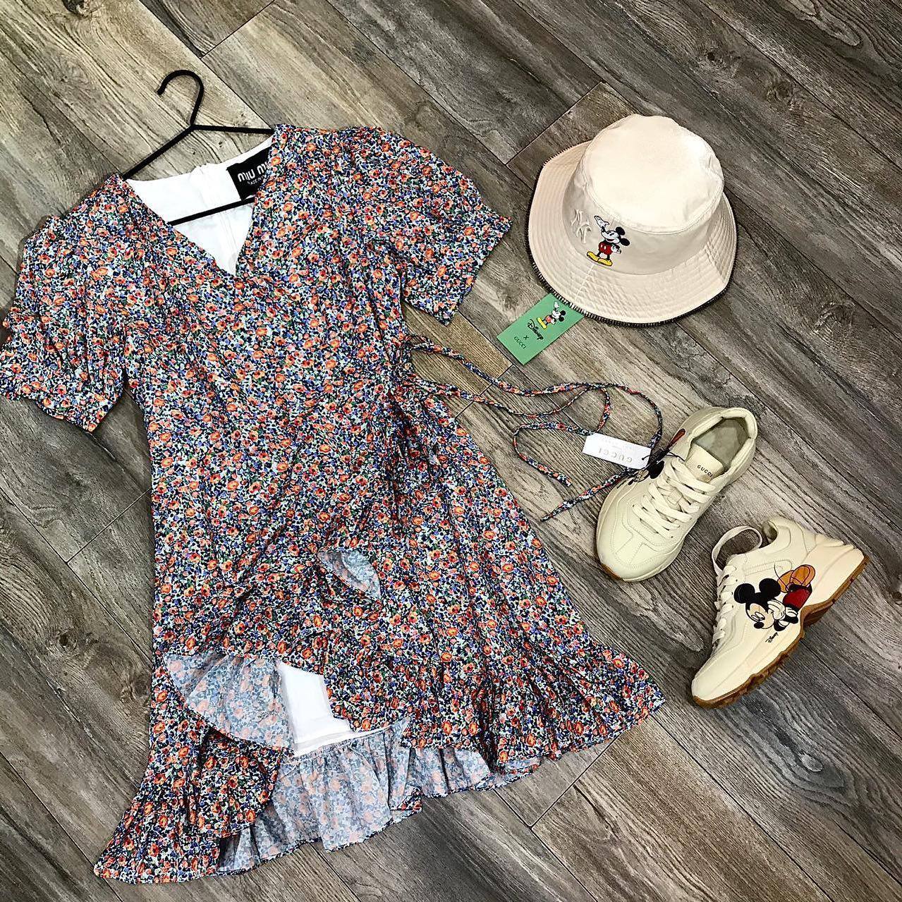 Платье Miu Miu LUX-33645 представляет собой женственное и романтичное платье с ярким цветочным принтом. Аккуратный V-образный вырез и объемные короткие рукава добавляют изящества, а пояс подчеркивает талию, создавая женственный силуэт. Оборка по низу платья придает ему игривый и воздушный вид, делая его идеальным выбором для летних образов.