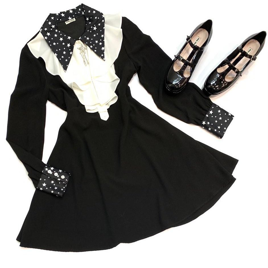 Это женственное платье Miu Miu LUX-45719 выполнено в контрастном черно-белом исполнении, подчеркивающем его уникальный дизайн. Акцентная деталь – воротник с принтом в виде звезд и пышная оборка по центру, придающая образу игривость. Манжеты также украшены звездным узором, гармонируя с воротником. Это платье идеально подойдет для создания эффектного образа на особое мероприятие или для повседневного стиля с ноткой эксцентричности.