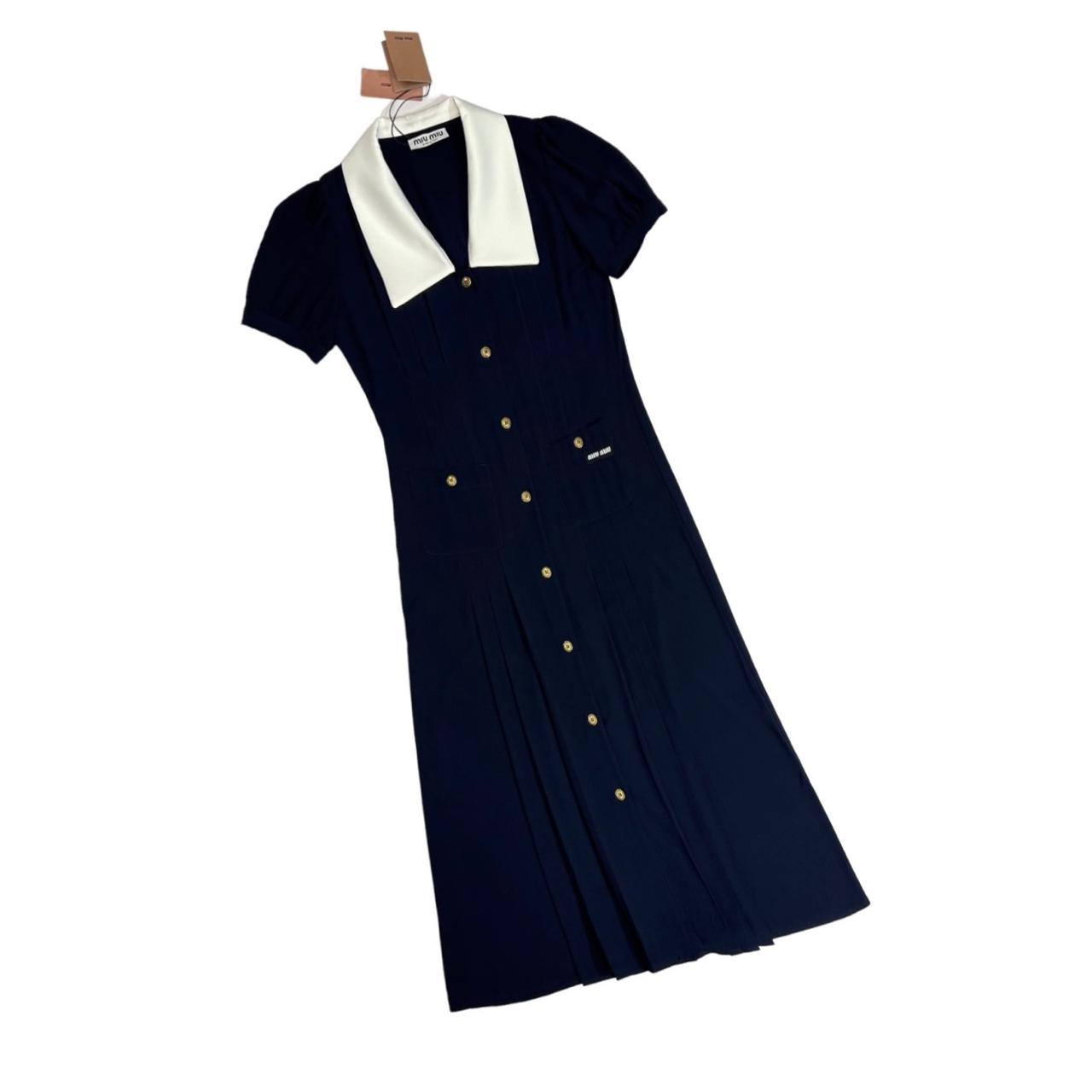 Платье Miu Miu LUX-108010 представляет собой элегантное платье темно-синего цвета с контрастным белым воротником. Платье выполнено в классическом стиле, с короткими рукавами и пуговицами. Оно идеально подойдет для создания утонченного и изысканного образа.