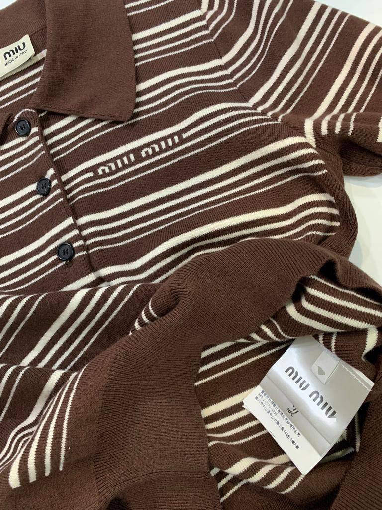 Поло Miu Miu LUX-93961 - это стильный предмет гардероба от известного бренда. Поло выполнено в сочетании коричневого и белого цветов в полоску, имеет короткие рукава и воротник. Данная модель идеально подойдет для создания повседневных образов.
