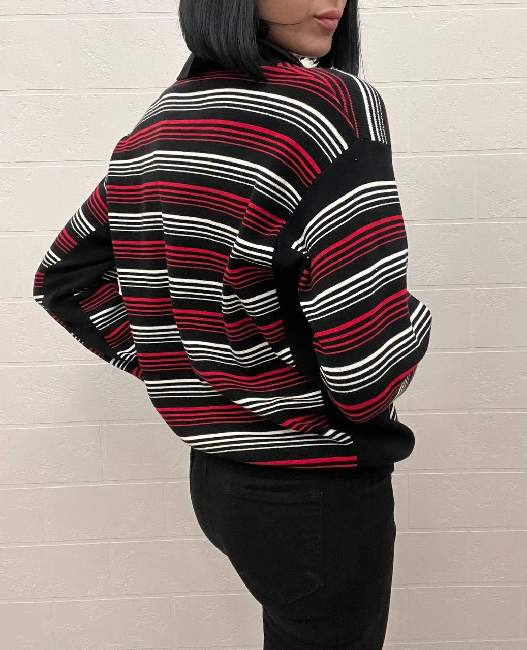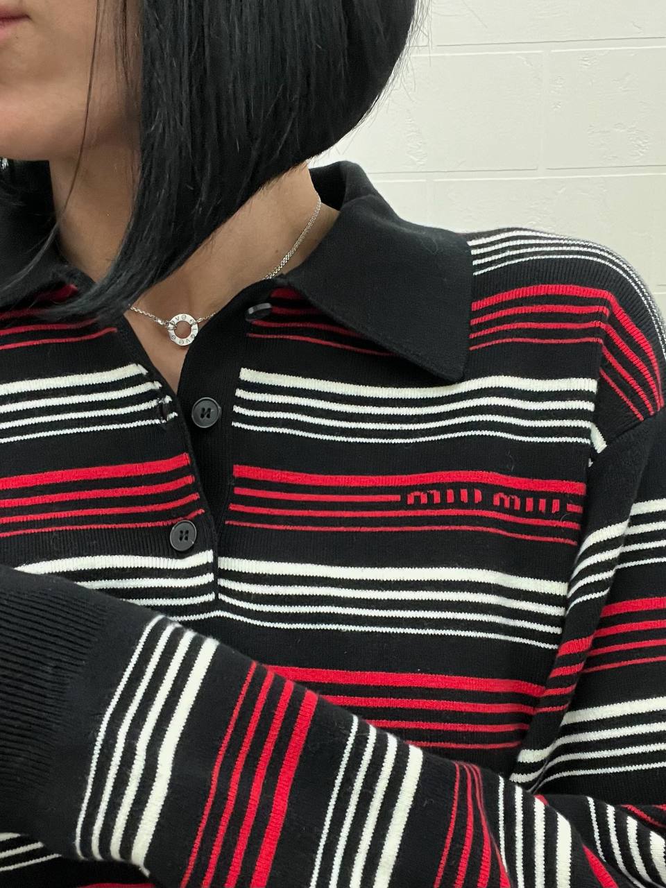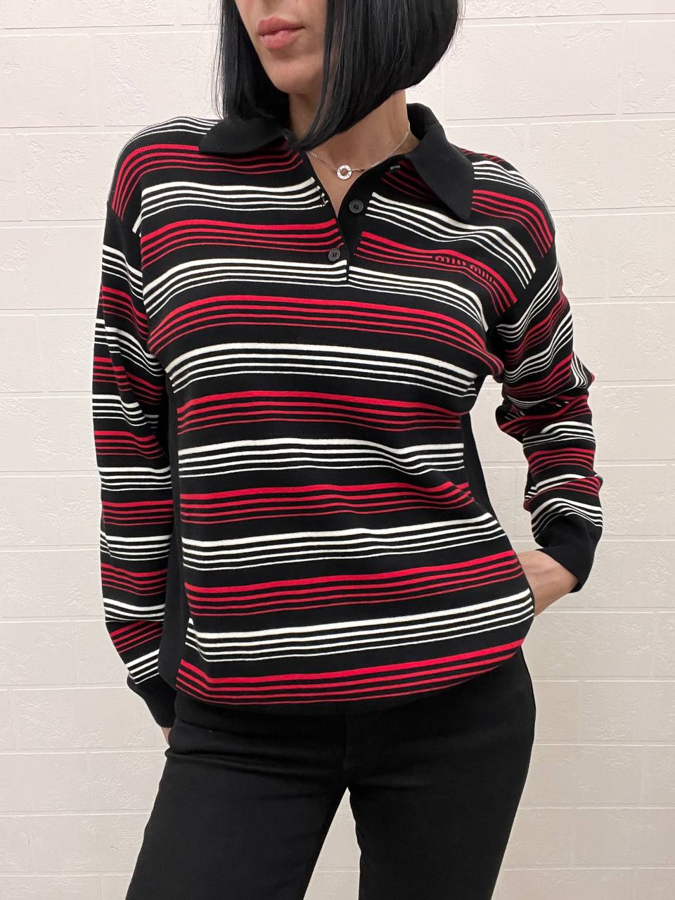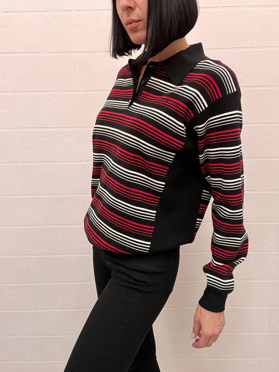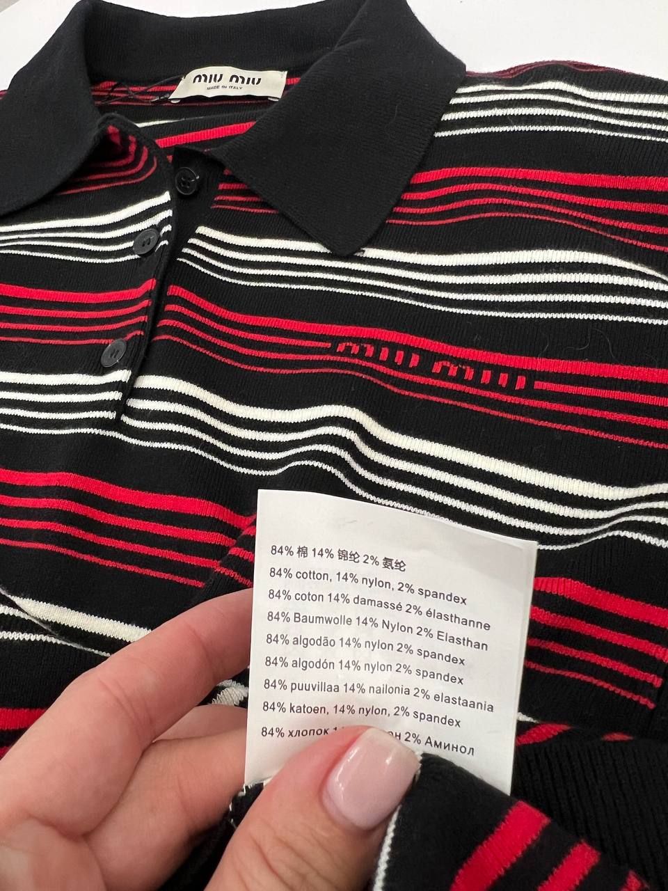 Поло Miu Miu LUX-109065 — это стильный предмет гардероба, который сочетает в себе элегантность и современный дизайн. Поло выполнено в черно-красную полоску с добавлением белого, что создает динамичный и выразительный образ. Эта модель подходит для создания как повседневных, так и более формальных ансамблей.
