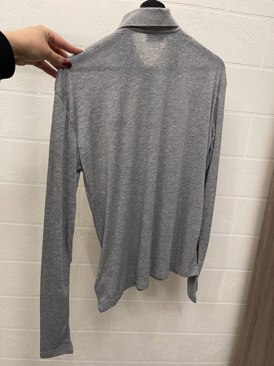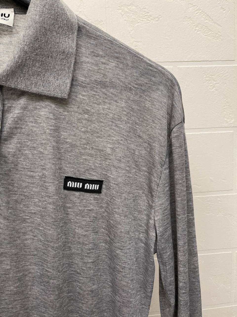 Поло Miu Miu LUX-114587 выполнено в современном стиле, сочетает в себе элегантность и повседневность. Серая модель с длинными рукавами и отложным воротником легко комбинируется с различными элементами гардероба. Прекрасно подходит для создания стильных образов на каждый день.