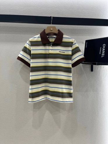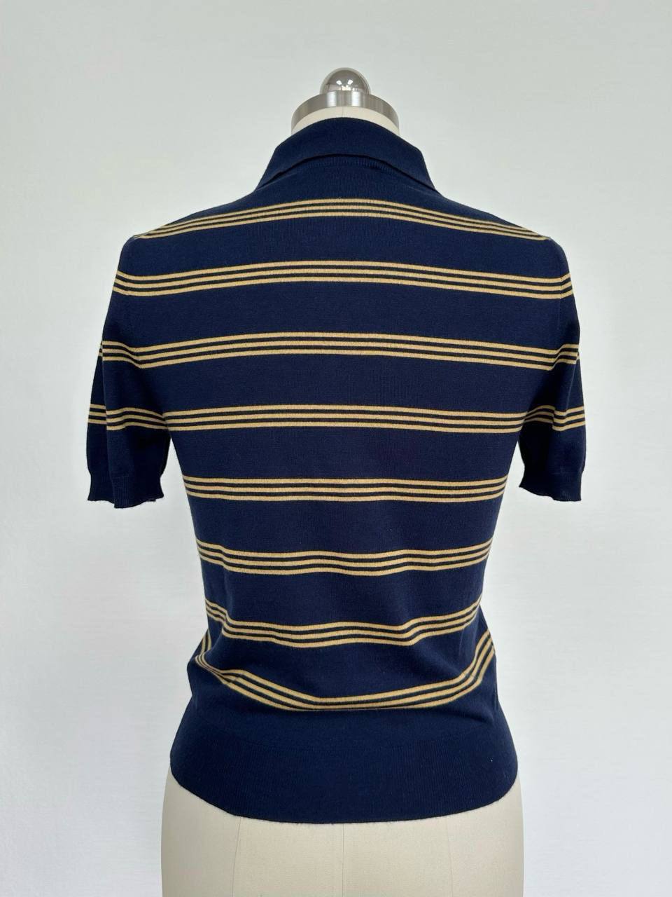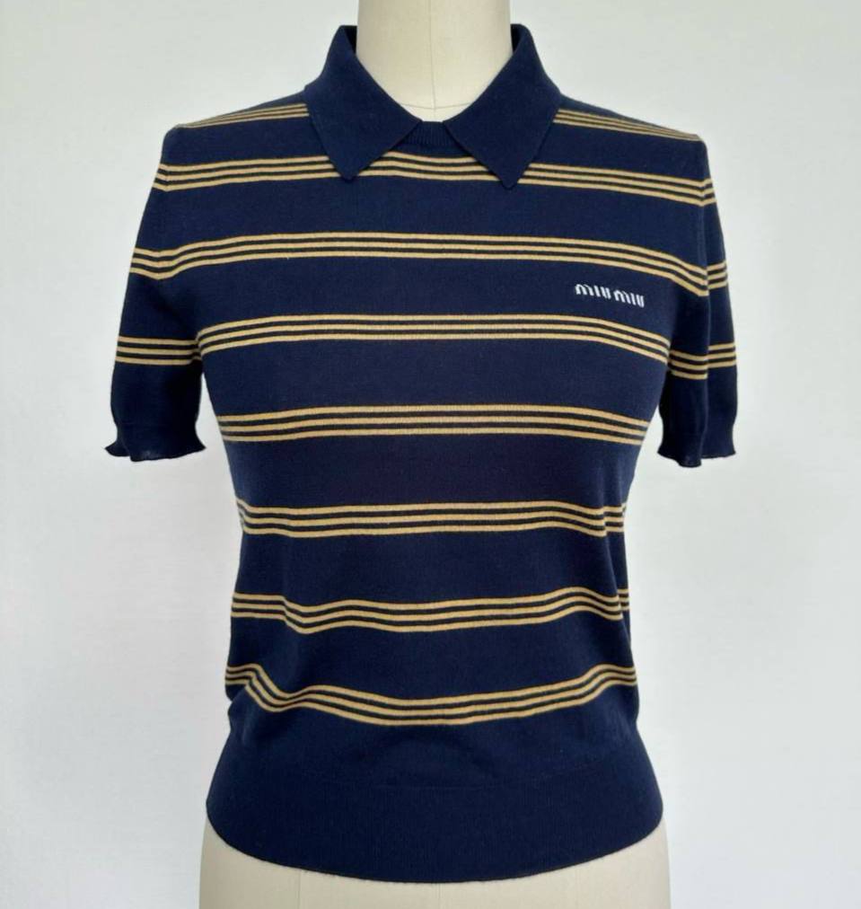 Поло Miu Miu LUX-121720 - это стильное и элегантное дополнение к гардеробу современной женщины. Модель выполнена в классическом полосатом дизайне, сочетающем в себе синий и золотистый оттенки, что придает ей изысканность.
