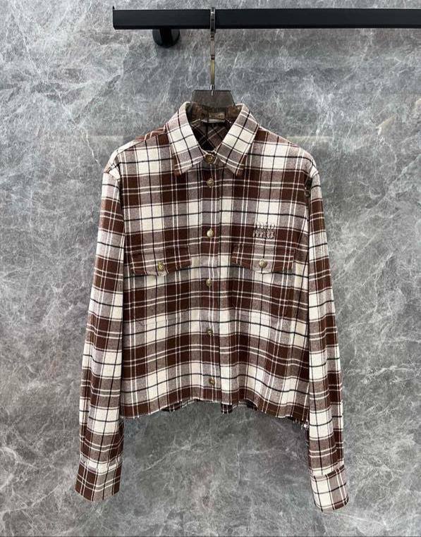 Рубашка Miu Miu LUX-111465 - это стильная рубашка в клетку, выполненная в теплых тонах. Клетка выполнена в коричневом и кремовом цвете, что создает эффектный внешний вид. Эта рубашка идеально подойдет для создания как повседневных, так и более элегантных образов.