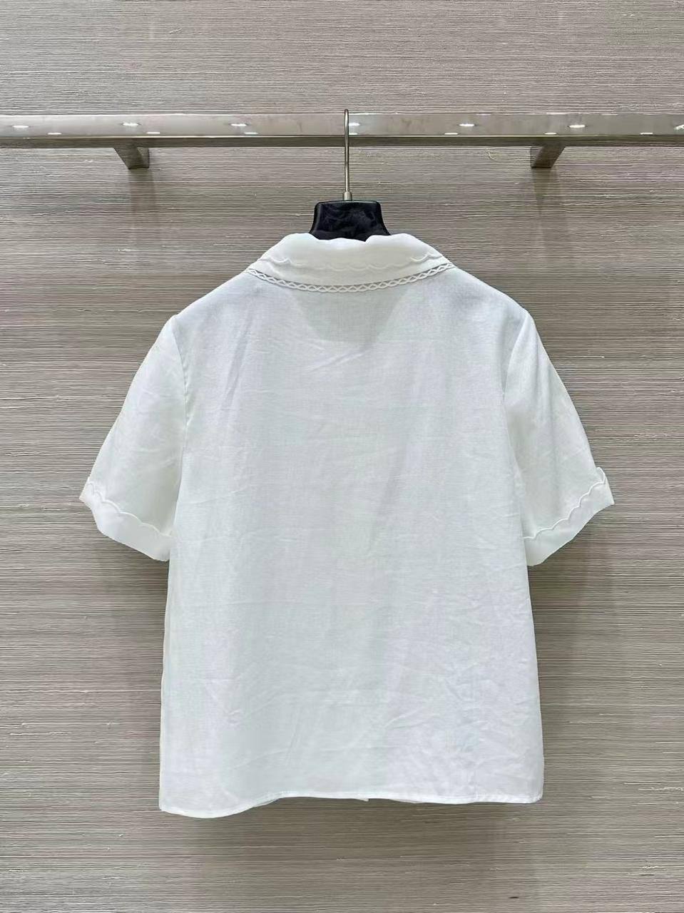 Рубашка Miu Miu LUX-116994, представленная на изображении, выполнена в классическом стиле. Она выполнена в белом цвете и имеет короткие рукава, а также воротник с кружевной отделкой. Рубашка идеально подходит для создания элегантных и женственных образов.