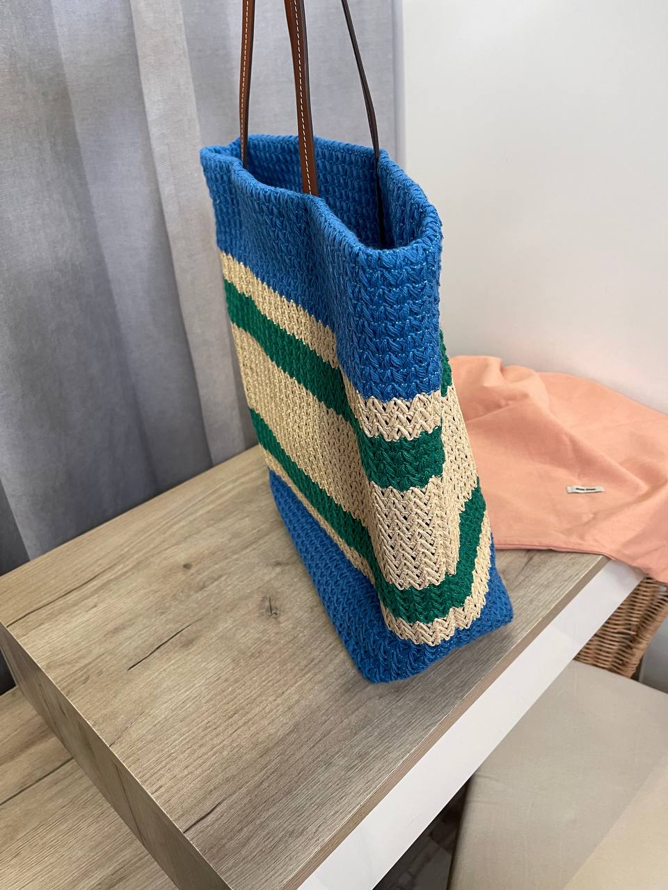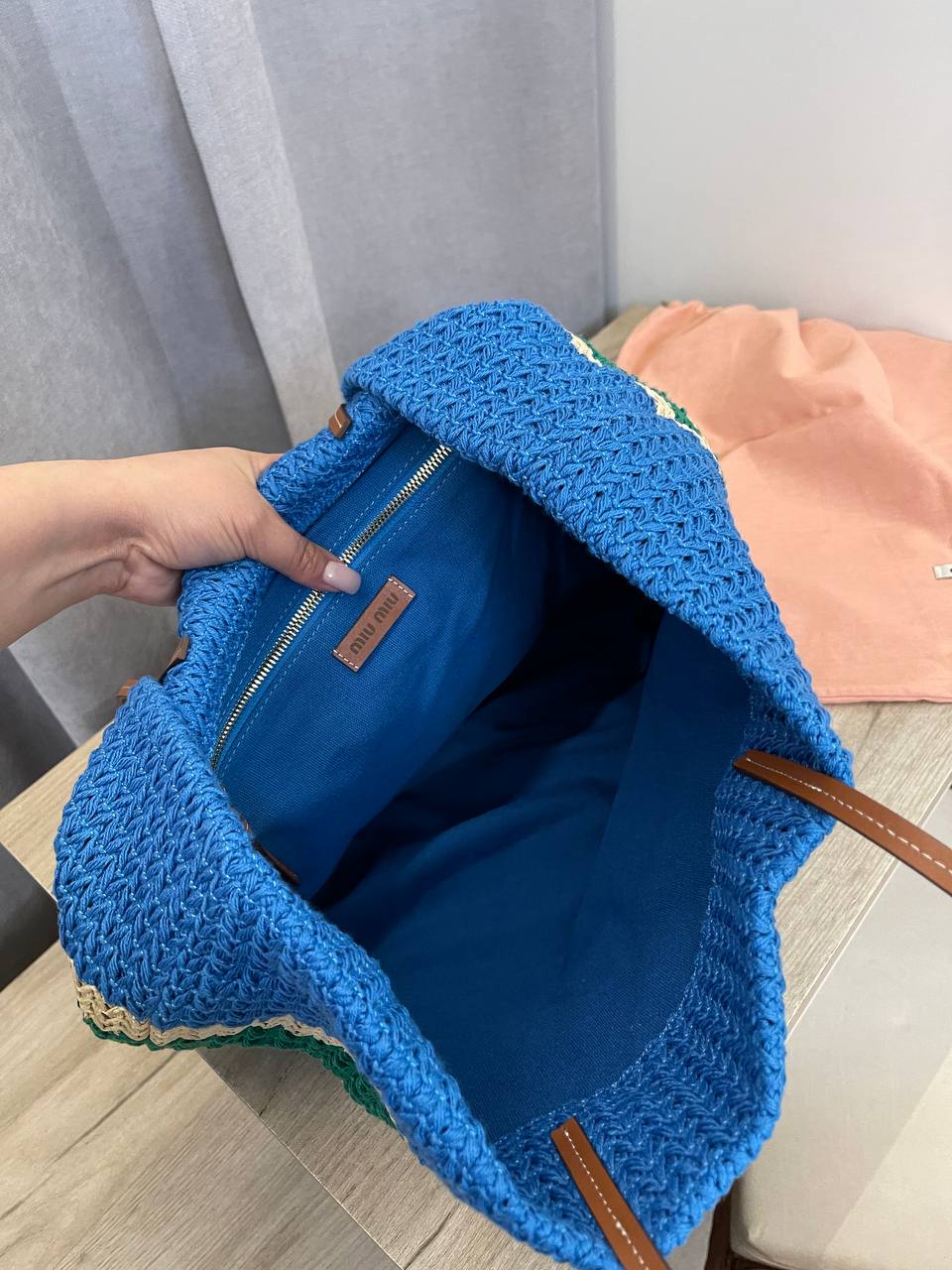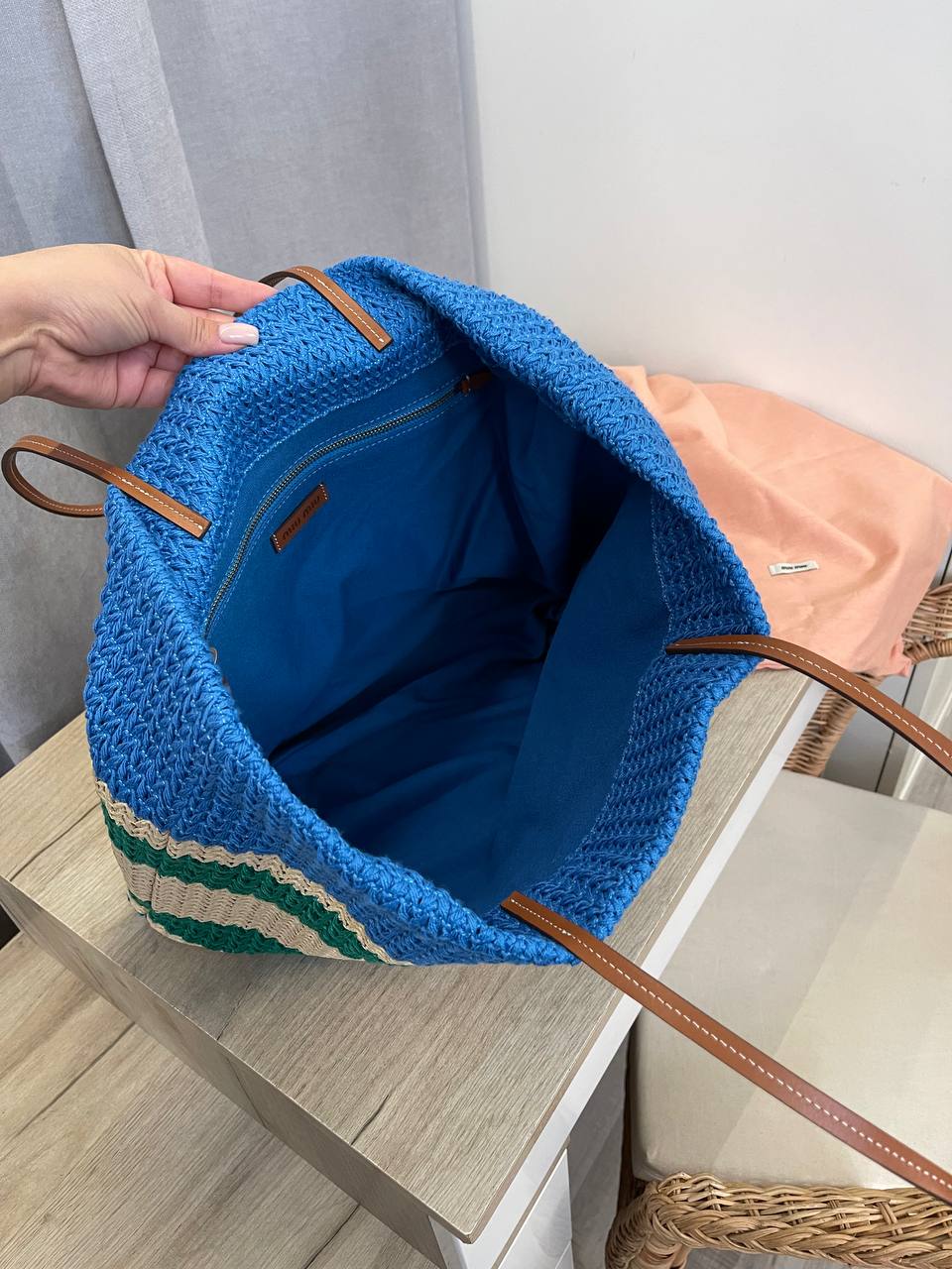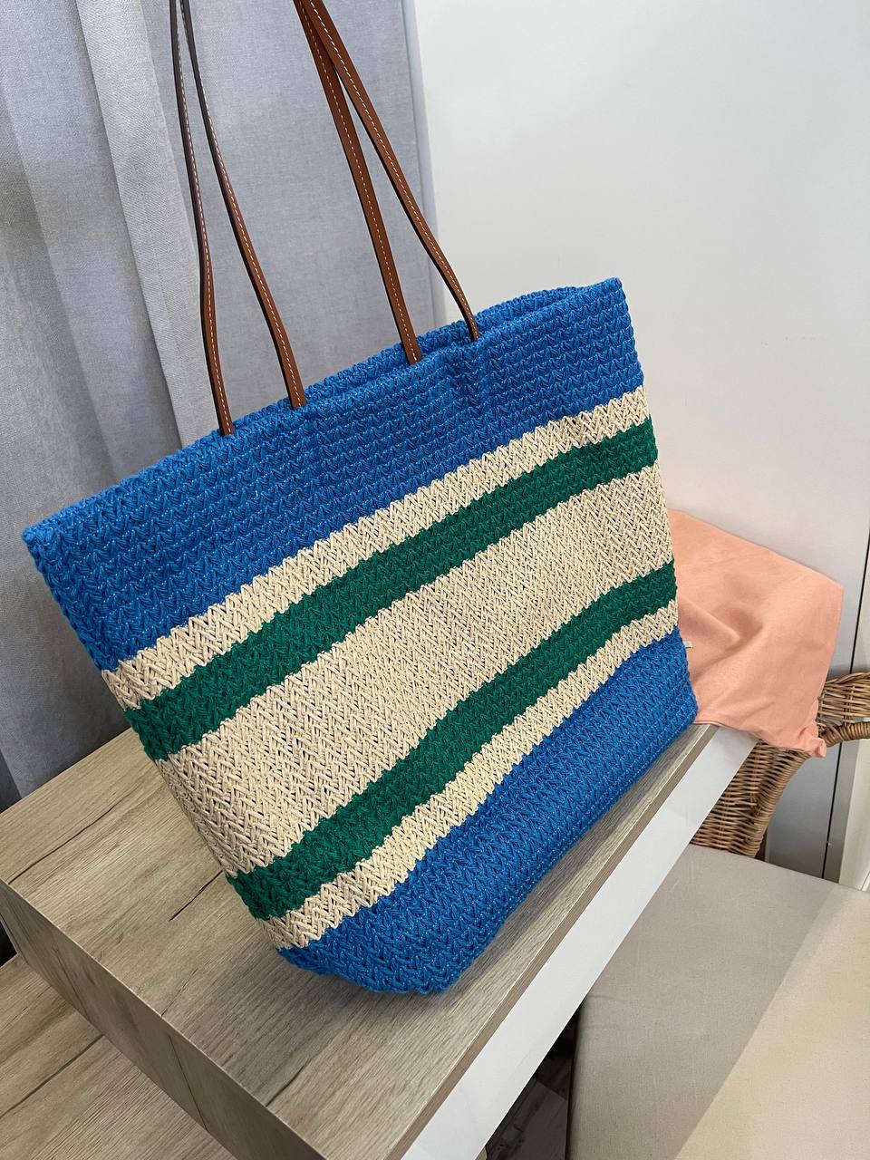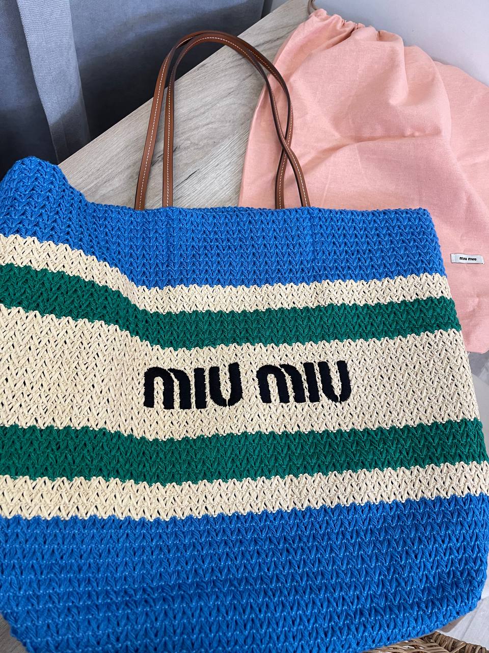 Сумка женская Miu Miu LUX-107042 – это стильный аксессуар в пляжном стиле. Она выполнена в полосатом дизайне, сочетающем синий, зеленый и бежевый цвета, с контрастным логотипом бренда. Сумка имеет форму шоппера, что делает ее идеальной для повседневного использования и для отдыха.