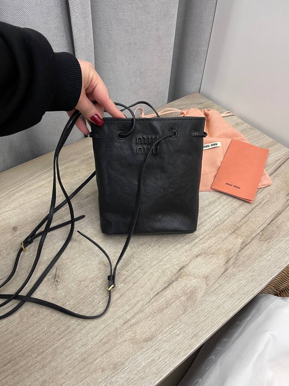 Женская сумка Miu Miu LUX-114608 выполнена в минималистичном стиле, имеет форму ведра, компактный размер и глубокий черный цвет. Текстура изделия матовая, что придает ему элегантность. Эта сумка идеально подойдет для повседневного использования.