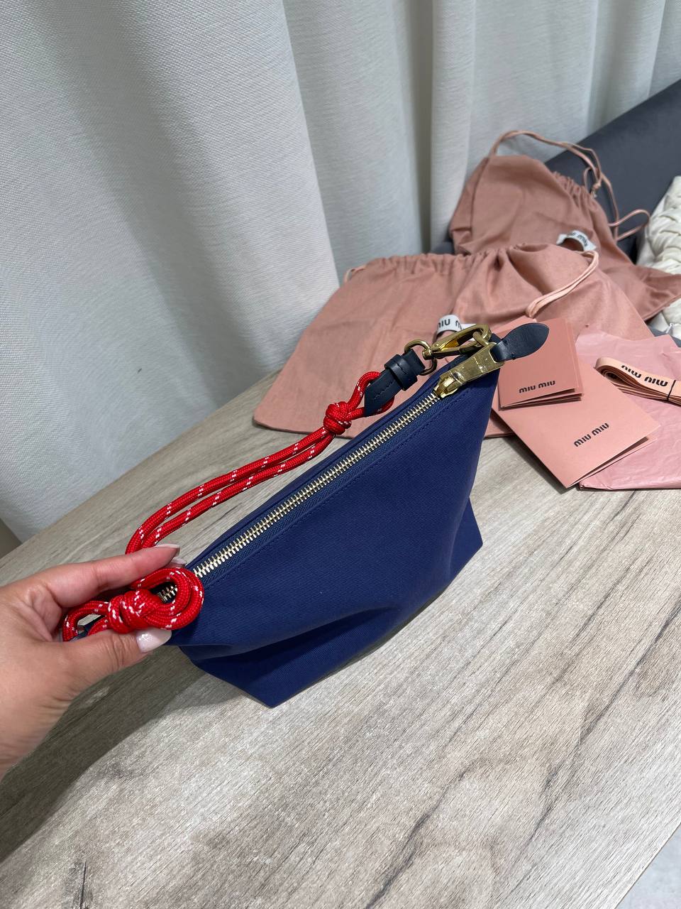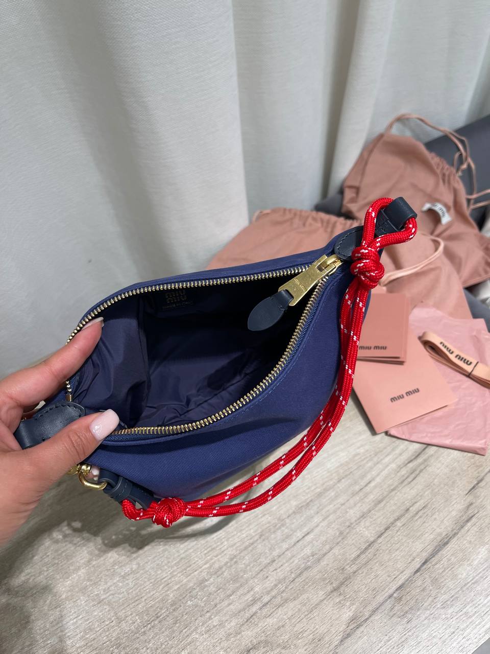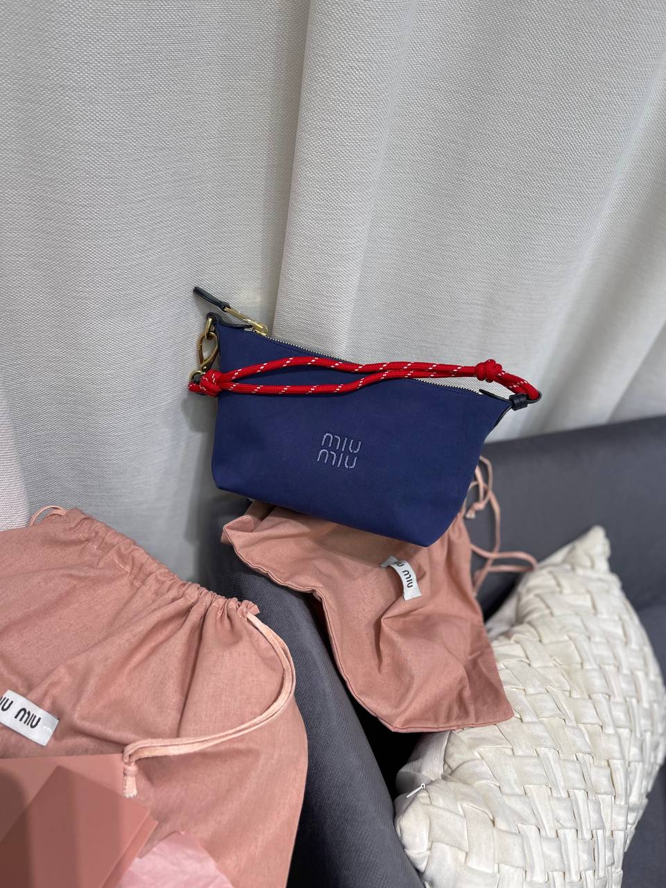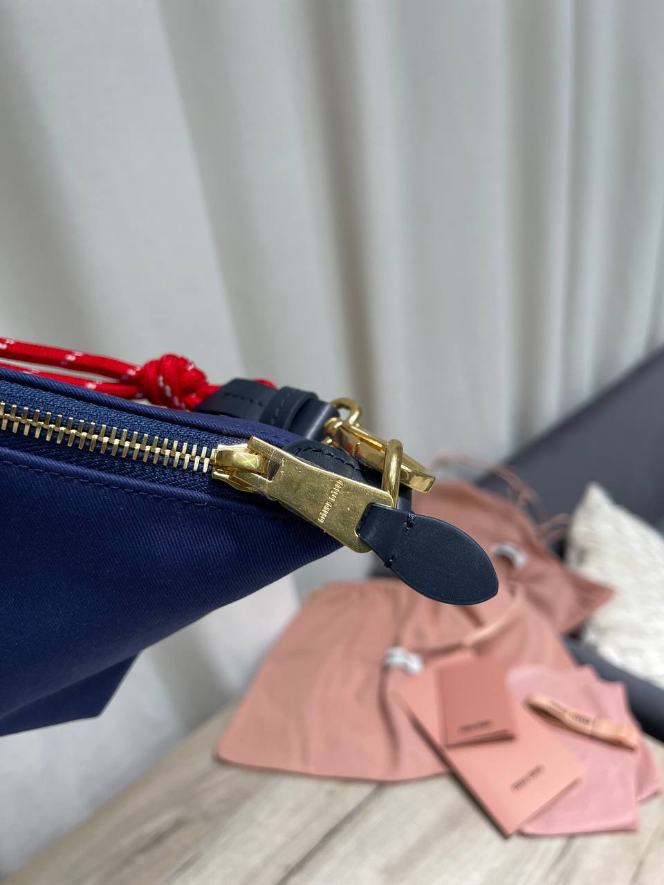 Сумка женская Miu Miu LUX-120032 – это стильный аксессуар, который сочетает в себе элегантность и функциональность. Сумка выполнена в насыщенном темно-синем цвете с вышитым логотипом. Красный ремешок-шнурок делает акцент на ярком дизайне.