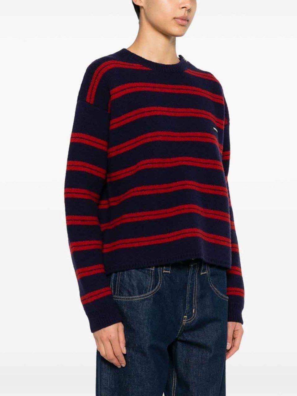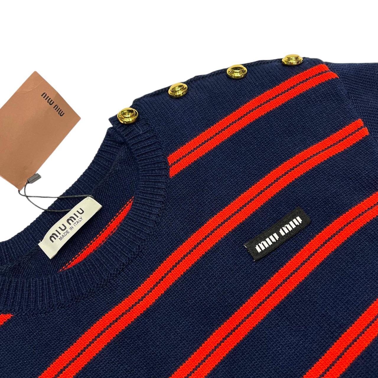 Свитер Miu Miu LUX-112306 — это стильный предмет гардероба, выполненный в темно-синем цвете с красными полосами. Свитер отличается простым дизайном, круглой горловиной и универсальным кроем. Он идеально подходит для создания повседневных образов в стиле casual.