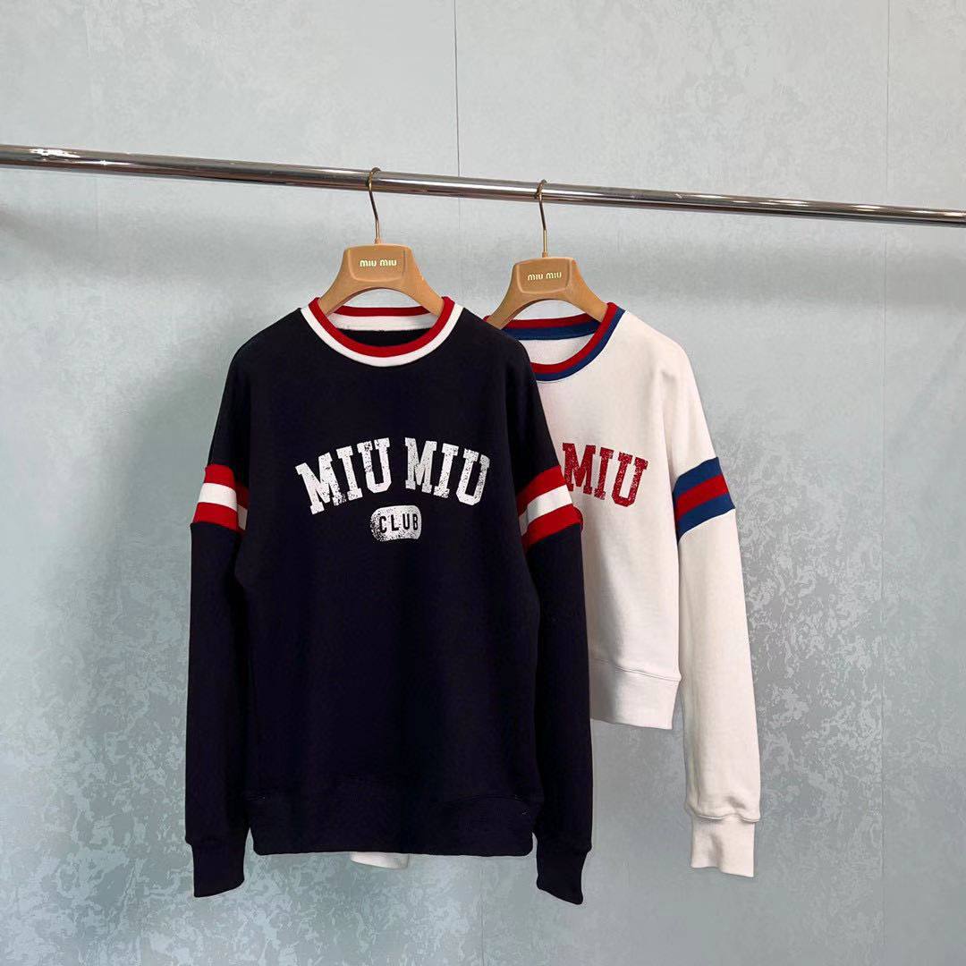 Свитшот Miu Miu LUX-72593 представлен в классическом стиле с контрастными полосами на рукавах и надписью «MIU MIU CLUB» спереди. Темно-синий цвет изделия придает ему элегантность, что делает его подходящим для различных повседневных образов.
