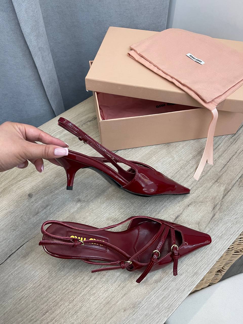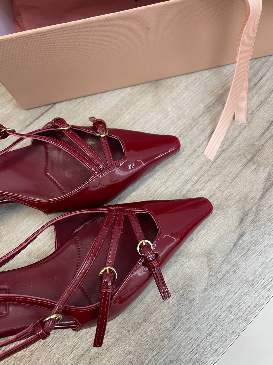 Туфли Miu Miu LUX-104751 - это элегантная обувь в классическом стиле. Туфли выполнены в бордовом цвете с острым мыском и небольшим каблуком. Декоративные ремешки добавляют изысканности и подчеркивают женственность.