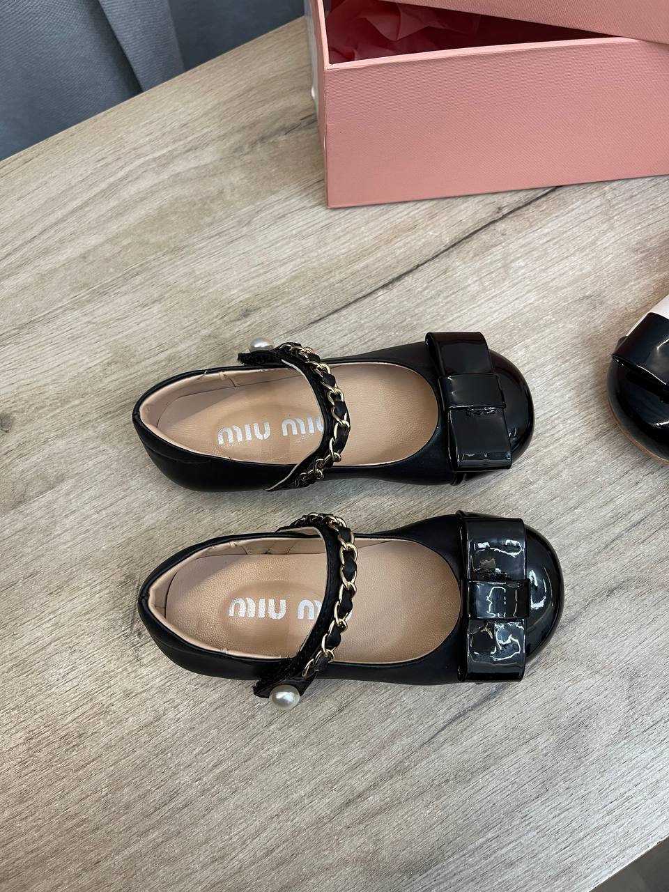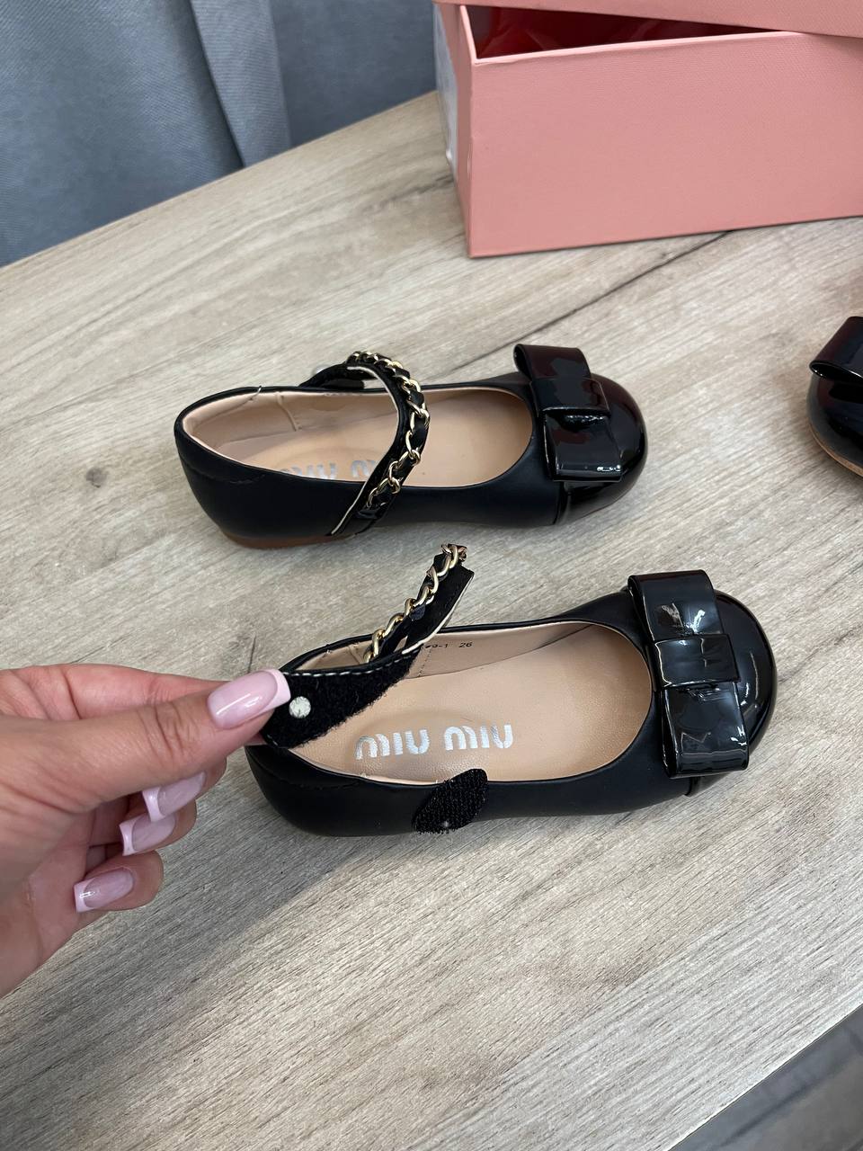 Туфли Miu Miu LUX-104897 - это элегантная обувь для девочек. Чёрные туфли, украшены декоративными бантами и цепочками. Классический дизайн делает их подходящими для различных случаев, от праздничных мероприятий до повседневных прогулок.