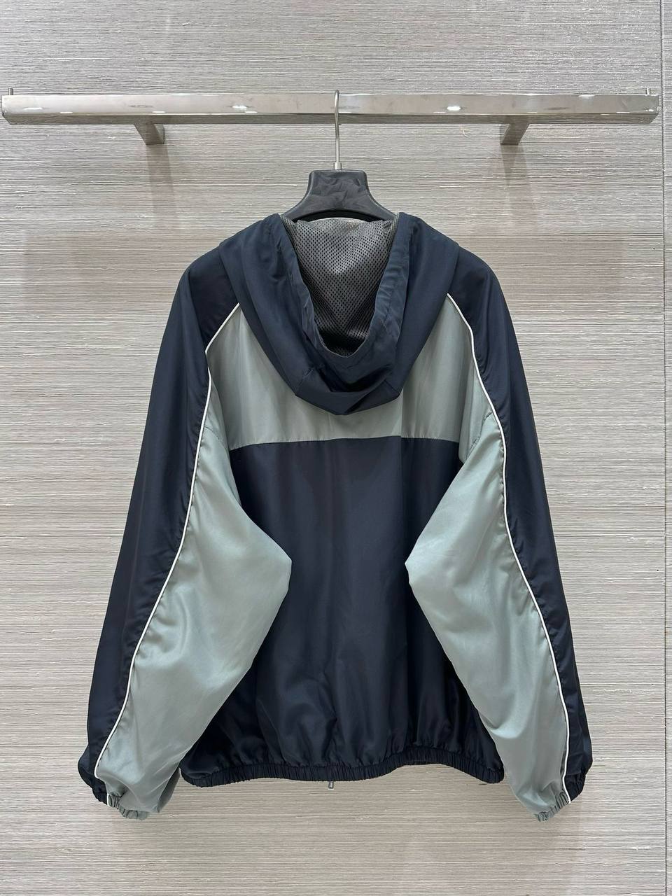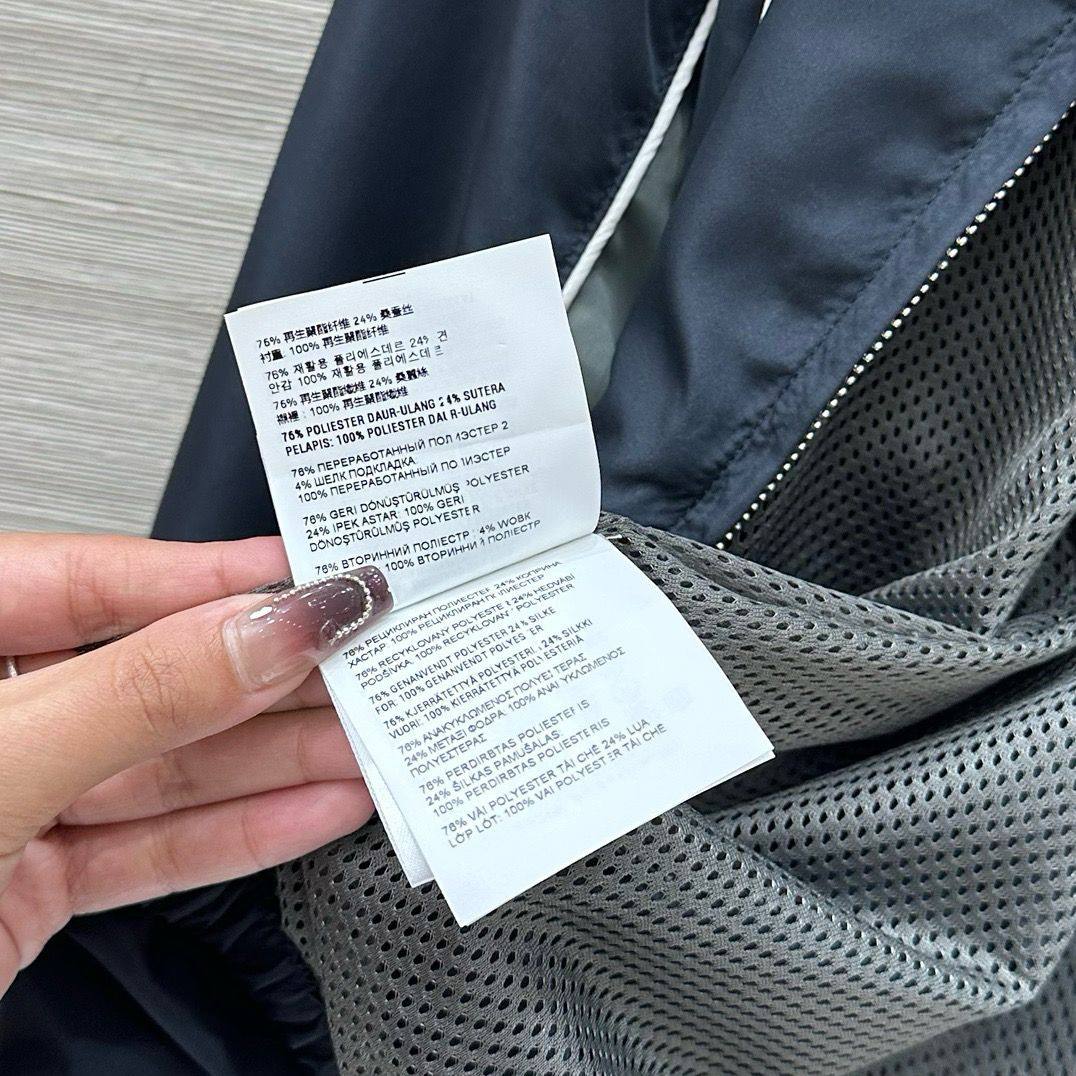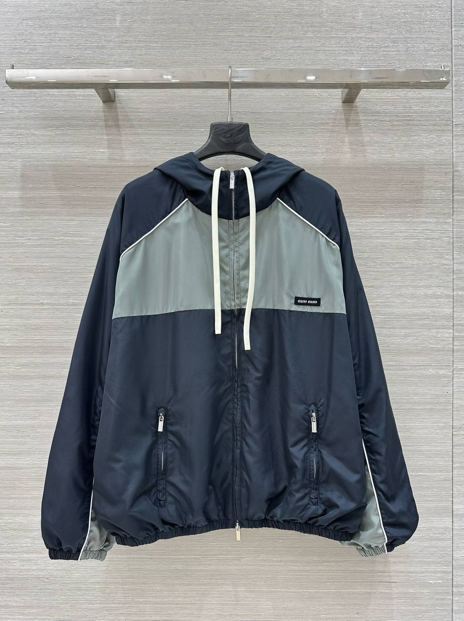 Ветровка Miu Miu LUX-117725 - это стильная и функциональная модель. Дизайн ветровки сочетает в себе спортивный стиль с элементами роскоши. Основные цвета - темно-синий и серый, с белыми акцентами, подчеркивающими детали.