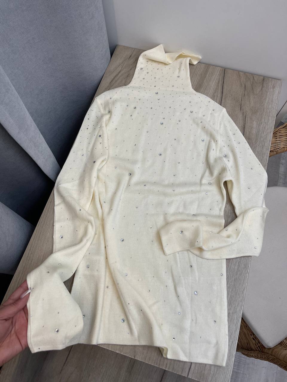 Водолазка Miu Miu LUX-101938 выполнена в элегантном стиле. Нежно-кремовый цвет и облегающий крой придают водолазке изысканный вид. Украшена россыпью страз, которые добавляют изящества и блеска.
