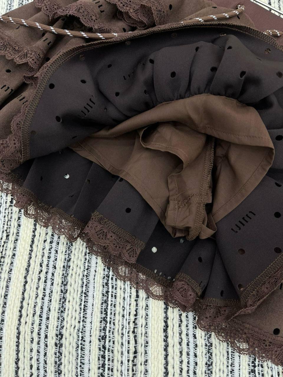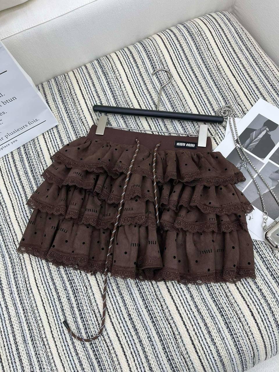 Юбка Miu Miu LUX-110809 - это очаровательная юбка от известного бренда. Она выполнена в игривом стиле, с многослойным дизайном и кружевными деталями. Юбка имеет насыщенный коричневый цвет, что делает её универсальной для различных образов.