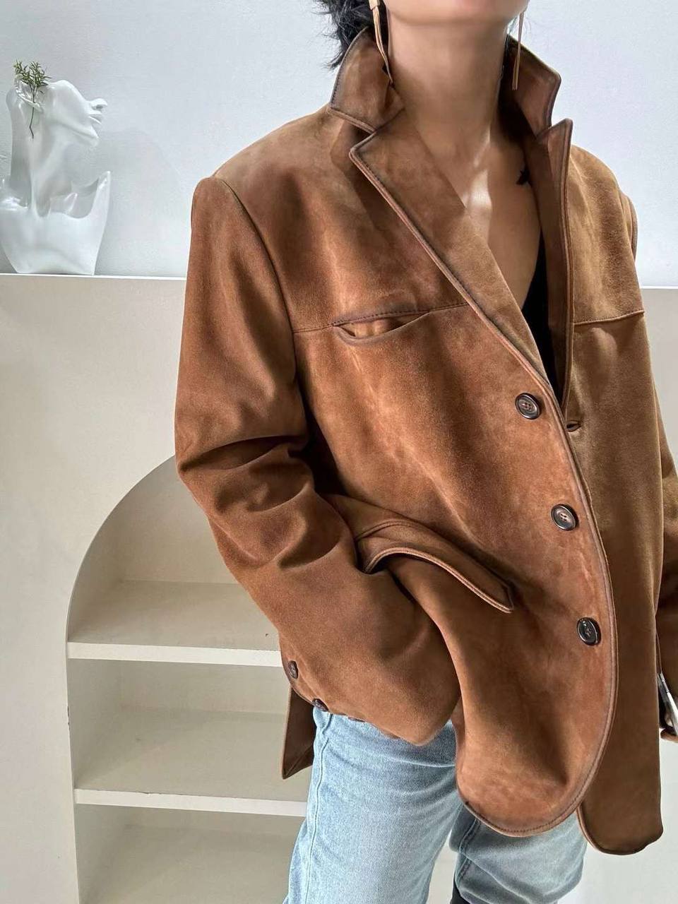 Замшевый жакет Miu Miu LUX-110199 - это стильный предмет гардероба от известного бренда. Жакет выполнен в классическом стиле с акцентом на современный крой, идеально подходящий для создания элегантных образов. Он представлен в теплом коричневом цвете, который добавляет изысканности и универсальности.