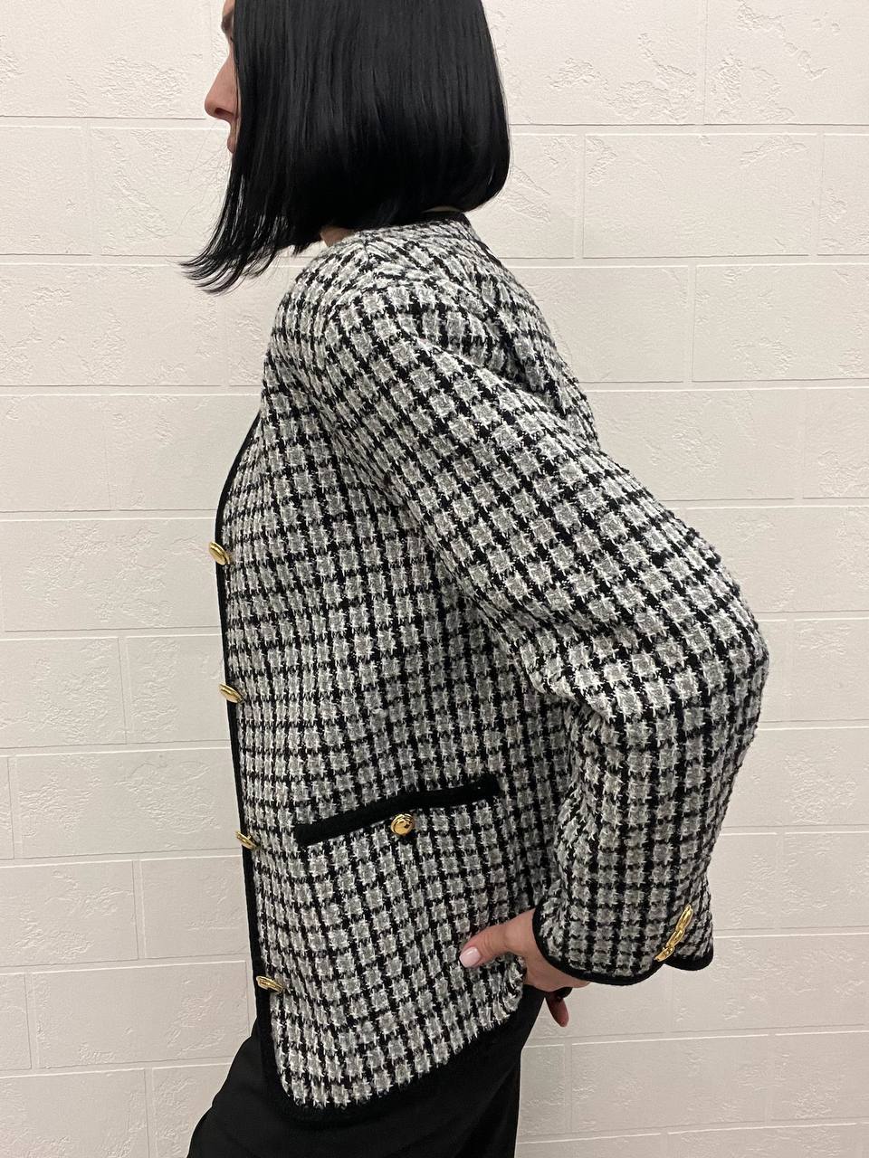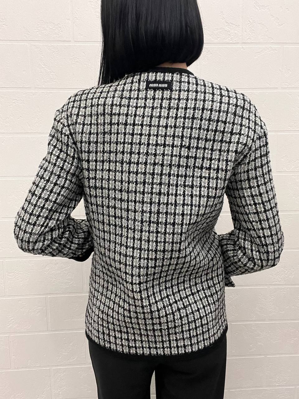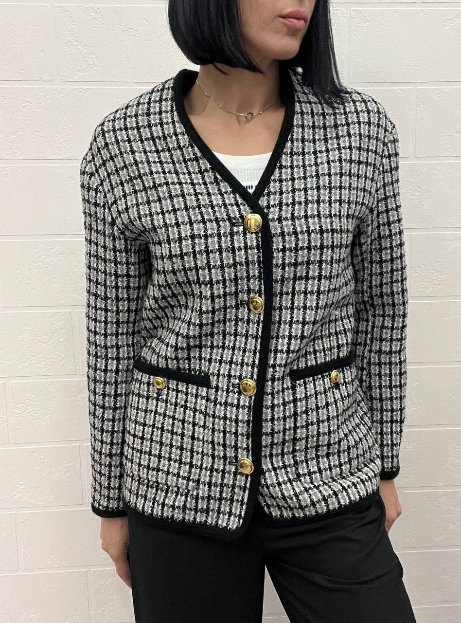 Жакет Miu Miu LUX-104937 представляет собой стильный жакет в классическом стиле. Он выполнен в черно-белой клетке с черной отделкой по краям и золотистыми пуговицами. Этот жакет станет отличным дополнением к повседневному или деловому образу.