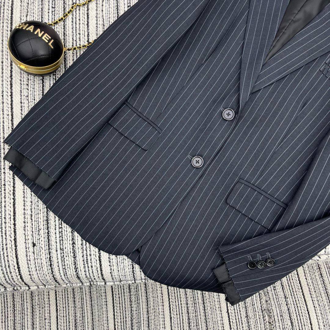 Жакет Miu Miu LUX-109244 представляет собой классический пиджак в полоску, выполненный в темно-синем цвете с белыми тонкими полосами. Жакет имеет строгий силуэт, две пуговицы и карманы, что делает его универсальным элементом гардероба для различных образов. Он подойдет как для деловых встреч, так и для повседневной носки, добавляя элегантности и стиля.