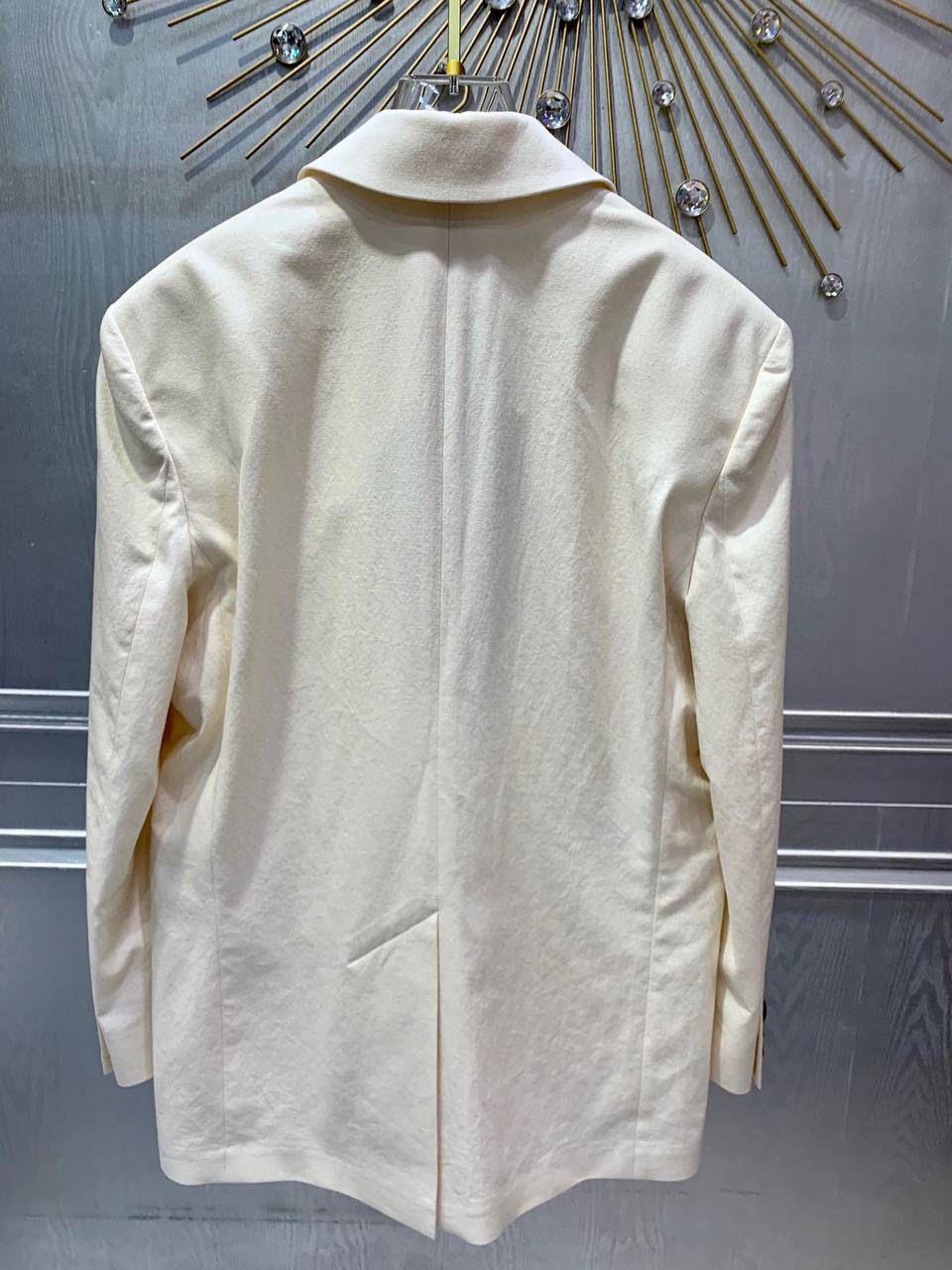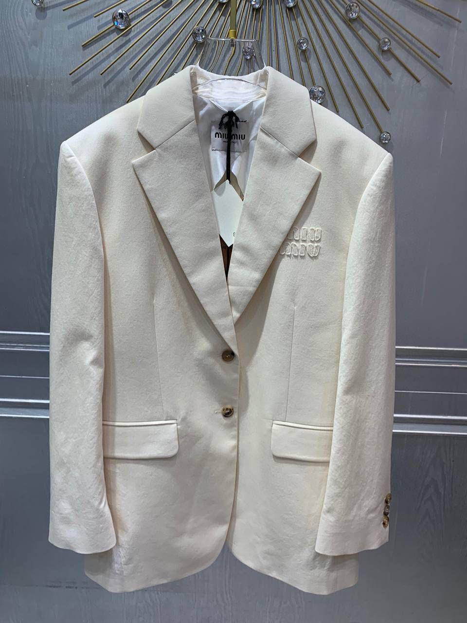 Жакет Miu Miu LUX-116685 - это элегантный предмет гардероба в классическом стиле. Жакет выполнен в кремовом цвете, что придает ему изысканный и универсальный вид. Текстура ткани выглядит гладкой и приятной на ощупь, подчеркивая премиальность изделия.