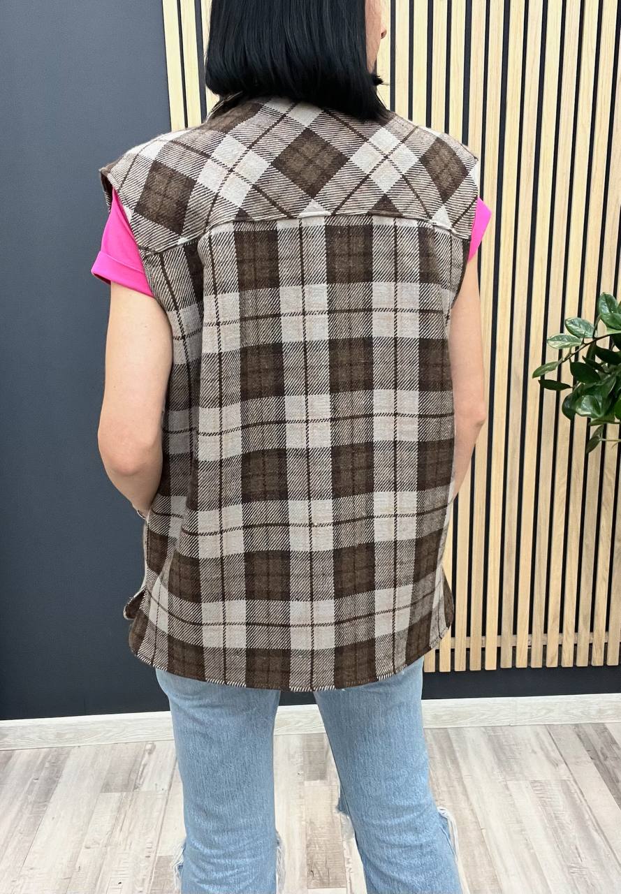 Жилет Miu Miu LUX-104315 – это стильный предмет гардероба в классическом клетчатом дизайне. Жилет выполнен в коричневых тонах, что делает его универсальным для создания различных образов. Он отлично подойдет для повседневной носки, добавляя образу изысканности и элегантности.